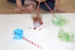 Que tal pintar com bolinhas de sabão? Para deixá-las coloridas, misturamos tintas guache com água e detergente em copinhos descartáveis. Depois, ofertamos um canudo para que a Sofie e sugerimos que ela soprasse dentro dos copinhos. A cada soprada, uma expressão de surpresa junto de uma risada. As bolhas cresciam dentro dos copinhos e derramavam na folha que estava no chão. Ela, claro, não queria mais parar de soprar!