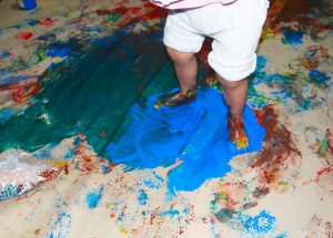 A nossa ideia era propor à Luiza que pintasse com os pés encapados com plástico bolha. Mas não teve jeito: ela não quis usá-lo de jeito nenhum. Então, a pintura foi feita com os pés direto na tinta mesmo. Forramos o chão com papel craft e e viramos um pouquinho de tinta no papel. Ela, claro, correu a pisar nas “poças”. Primeiro se divertiu sujando os pés nas tintas e carimbando o papel, chamando a atenção para a forma que fazia. Mas o ápice da brincadeira foi quando ela iniciou uma espécie de sapateado sobre as tintas, caindo na gargalhada a cada deslizar. O apoio de um adulto é indispensável, pois o risco de escorregar é bem grande.