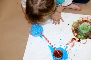 Que tal pintar com bolinhas de sabão? Para deixá-las coloridas, misturamos tintas guache com água e detergente em copinhos descartáveis. Depois, ofertamos um canudo para que a Sofie e sugerimos que ela soprasse dentro dos copinhos. A cada soprada, uma expressão de surpresa junto de uma risada. As bolhas cresciam dentro dos copinhos e derramavam na folha que estava no chão. Ela, claro, não queria mais parar de soprar!