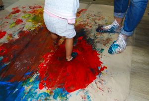 A nossa ideia era propor à Luiza que pintasse com os pés encapados com plástico bolha. Mas não teve jeito: ela não quis usá-lo de jeito nenhum. Então, a pintura foi feita com os pés direto na tinta mesmo. Forramos o chão com papel craft e e viramos um pouquinho de tinta no papel. Ela, claro, correu a pisar nas “poças”. Primeiro se divertiu sujando os pés nas tintas e carimbando o papel, chamando a atenção para a forma que fazia. Mas o ápice da brincadeira foi quando ela iniciou uma espécie de sapateado sobre as tintas, caindo na gargalhada a cada deslizar. O apoio de um adulto é indispensável, pois o risco de escorregar é bem grande.