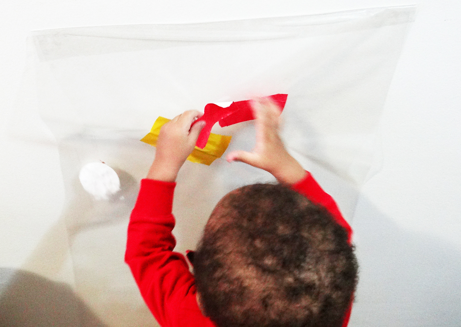 Às vezes, acabava colando as mãozinhas junto com o papel. E ficava curioso buscando entender como aquilo tinha acontecido. Depois tentou descolar alguns papéis, mas como o contact cola bem forte, eles acabavam rasgando.