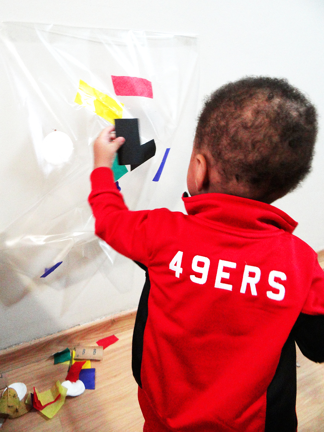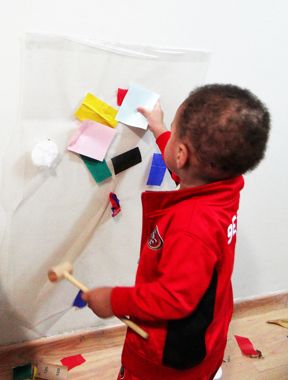 O Rafa gosta de brincadeiras de exploração, de experimentar aos pouquinhos, de analisar os materiais… Nesta proposta de cola e descola não foi diferente. Cortamos um pedaço grande de contact e o fixamos na parede, com a superfície adesiva para “fora”. Para prendê-lo, a gente apenas dobrou uma pequena faixa na parte de cima e na de baixo, mas, se quiser que fique mais firme, é só colar com fita adesiva nas laterais. Cortamos vários papéis coloridos, de diferentes tipos e texturas (colocamos algumas folhas secas também) e oferecemos tudo ao Rafa.