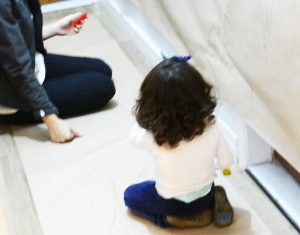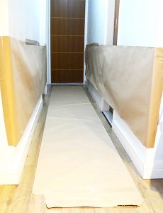 Se você tiver um corredor em casa, esse é o lugar ideal para o desenho com deslocamento. Nós forramos as duas paredes laterais com papel craft, na altura da Luiza, e também o chão.