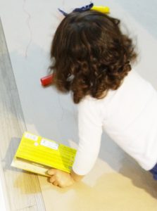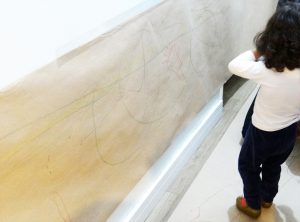 Depois se deu conta de que também poderia desenhar no chão. E foi o que fez. Até esse momento, não houve qualquer deslocamento, ela ficou paradinha, mas já estava curtindo demais a possibilidade de rabiscar sem muita limitação de espaço.