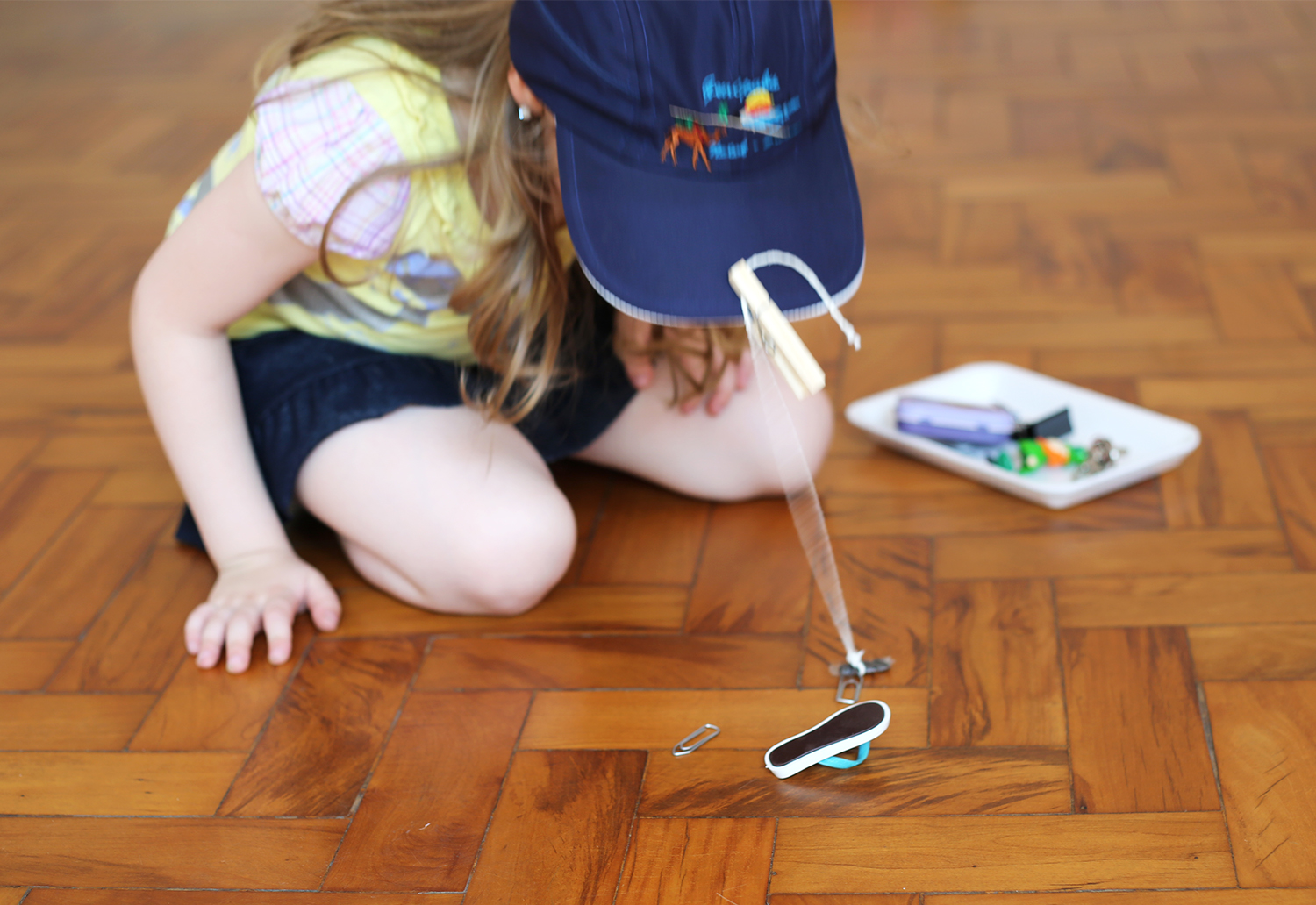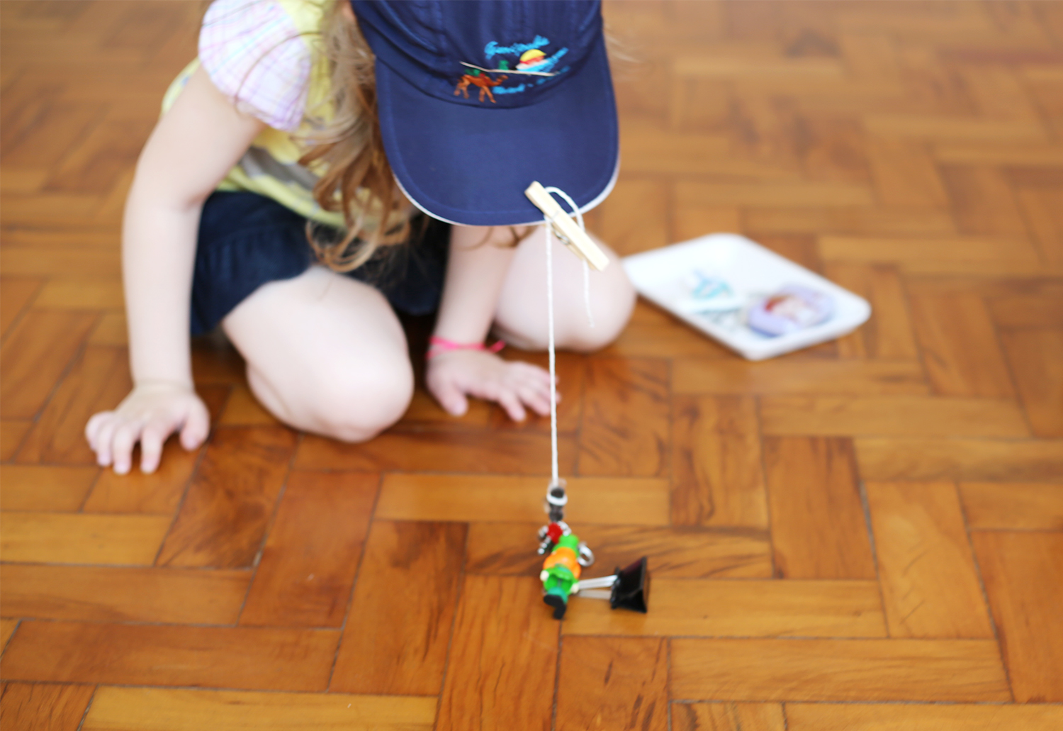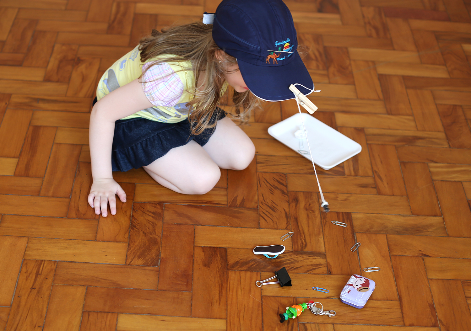 Colocamos um boné na cabeça da Sofie e, na aba, prendemos com um pregador de roupa um barbante com um ímã na pontinha. Estava pronta a nossa vara de pescar. No chão, distribuímos uma série de objetos magnéticos: clipes, ímãs de geladeira, caixinha de metal, chaveiro. Só não pode ser nada muito pesado, ou a varinha não vai aguentar. E entregamos a ela uma bandejinha de isopor, para ela depositar os objetos coletados.