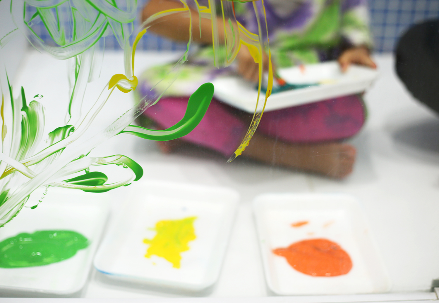 A nossa proposta foi convidar a Luiza a pintar com tinta guache em uma superfície de vidro. Nós usamos o boxe do banheiro, mas você também pode optar por uma porta de sacada, uma janela… A Lulu escolheu as cores que queria utilizar e nós as colocamos em bandejas de isopor, para facilitar o manuseio. E lá fomos nós com as tintas todas para o banheiro. No começo, ela não entendeu nada, e ficou com aquela cara de interrogação (ainda mais quando a chamamos para entrar dentro do boxe). Mas, quando se deu conta do que seria a brincadeira, o sorriso apareceu.