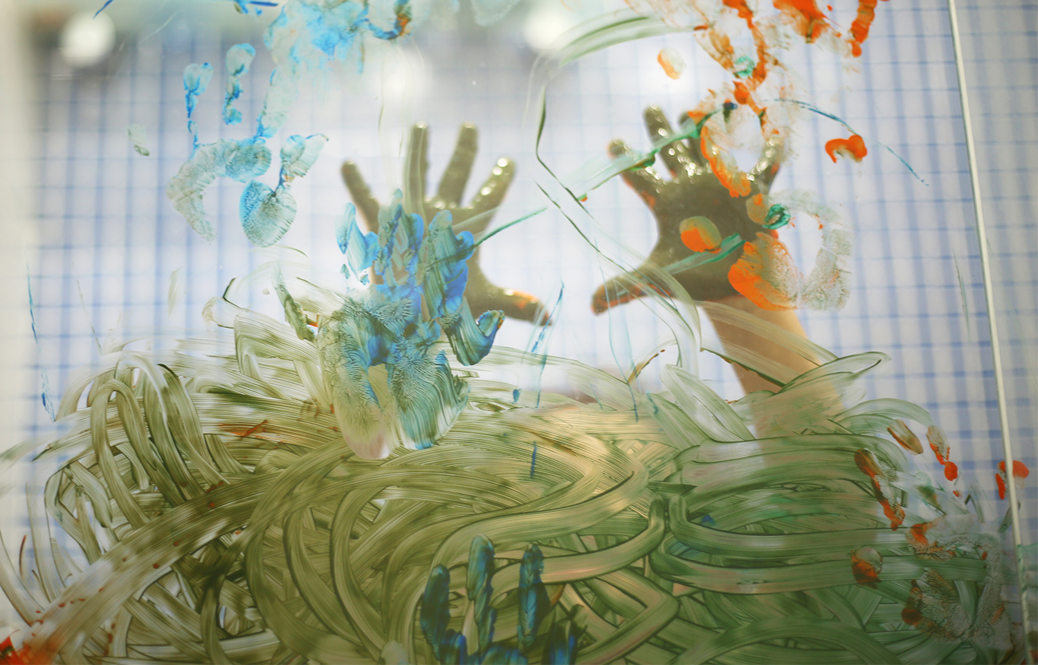 Não demorou muito e as outras tintas entraram em ação. Foi muito legal observar a forma como ela sentia seu dedo deslizar pelo vidro, uma superfície muito menos resistente do que o papel, por exemplo.