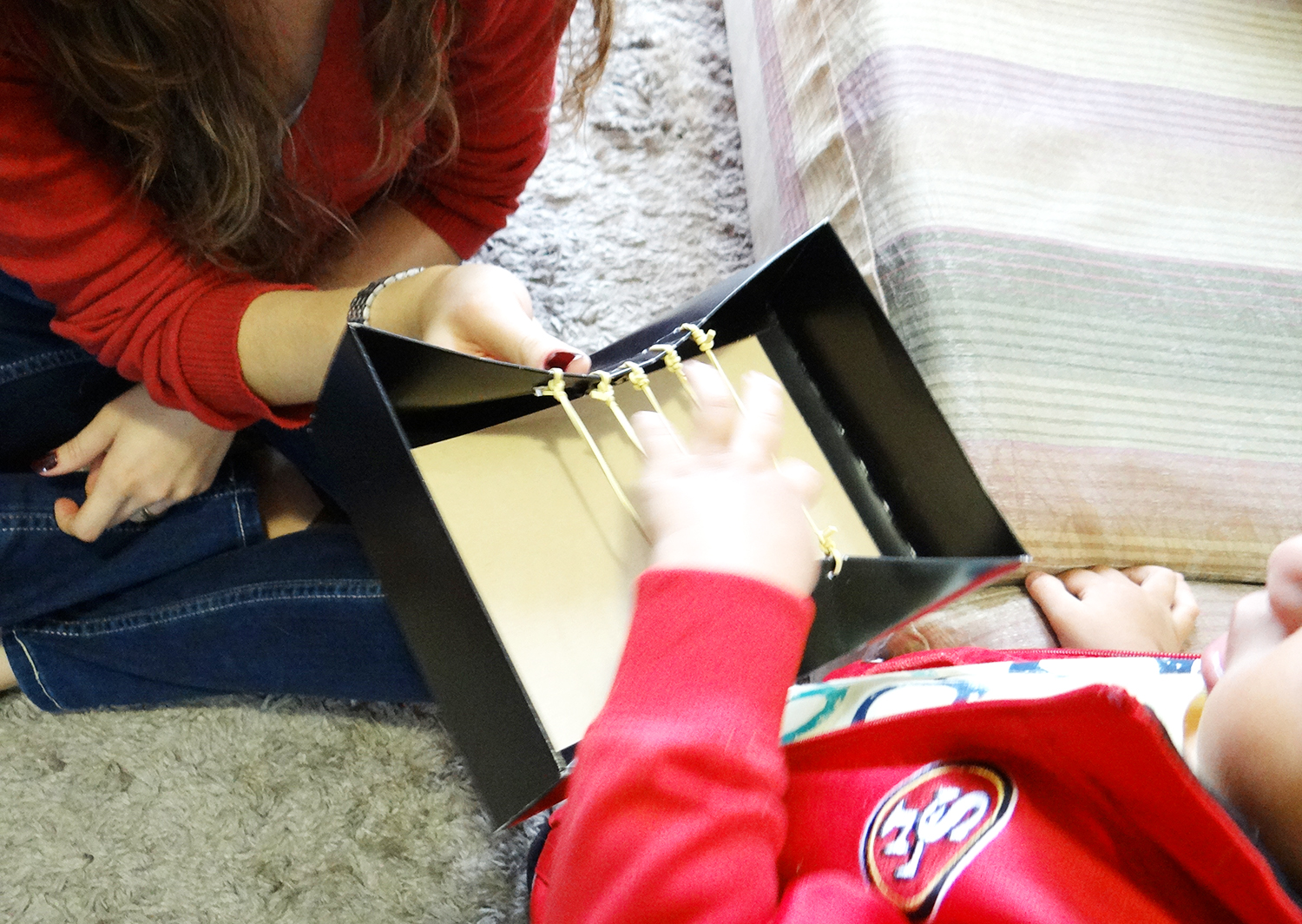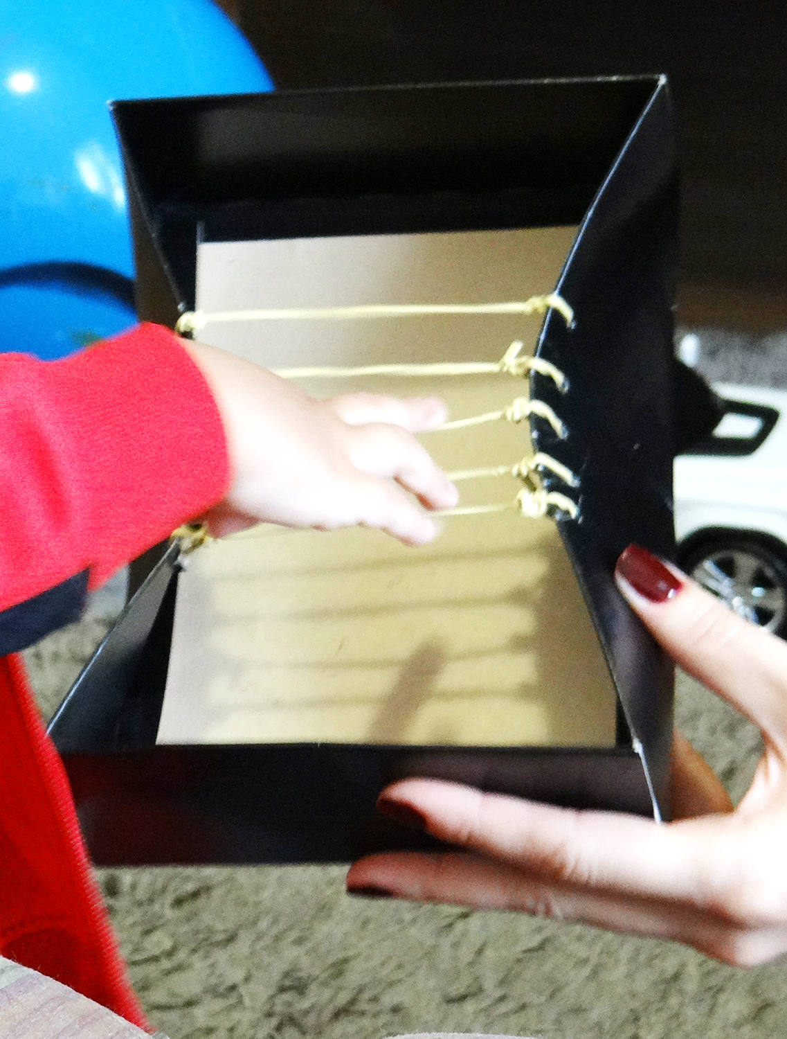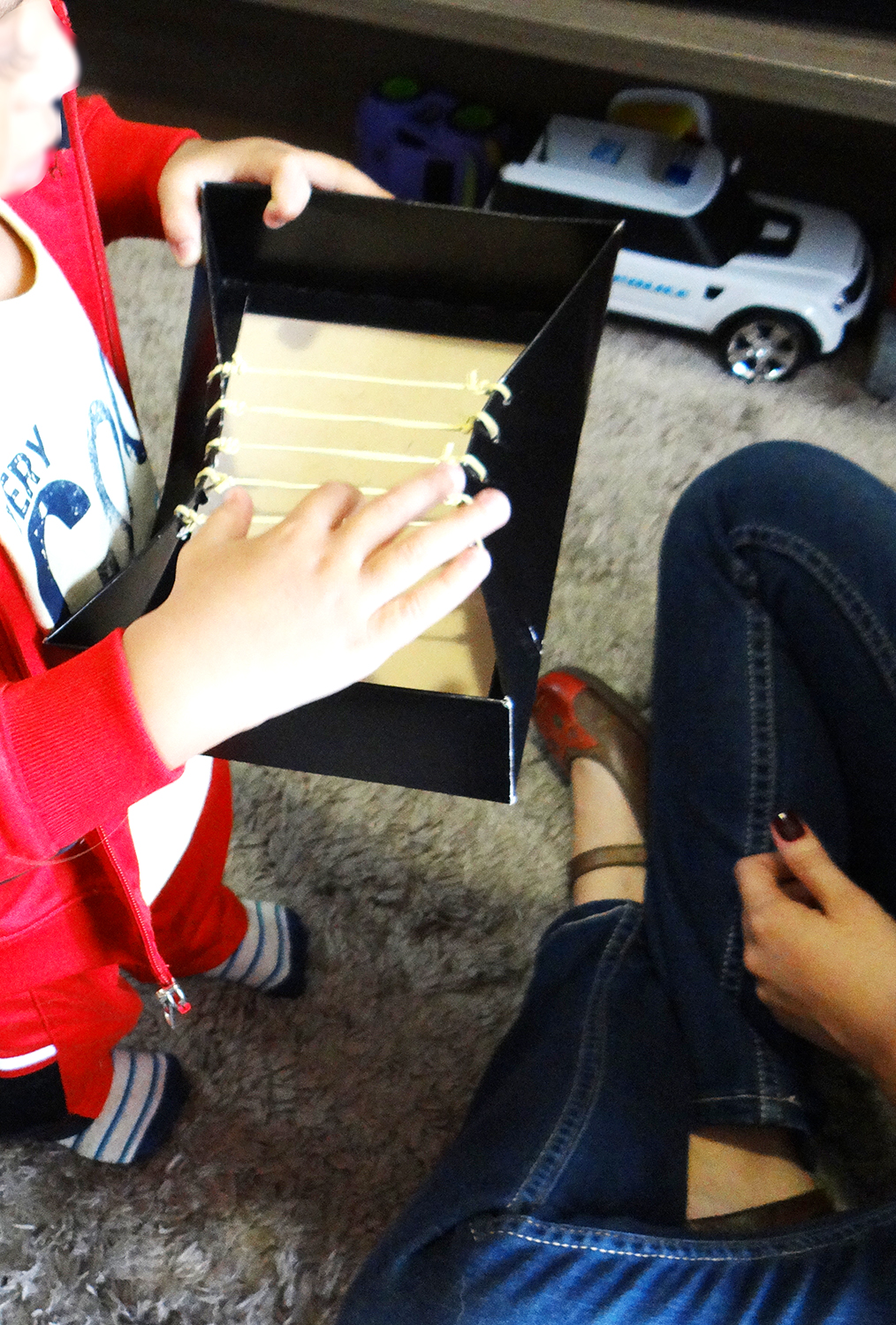 Não demorou muito e ele logo de apossou do violão, explorando os sons que conseguia produzir. E, gente, o elástico faz um som muito legal! O Rafa tocou e tocou, até não poder mais. Arriscou inclusive balançar o corpo acompanhando a melodia. Quando cansou de segurar a caixa, apoiou-a no sofá e dá-lhe mais música.