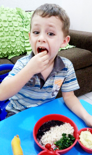 O Vicente come muito bem, tem um apetite invejável e adora legumes e frutas, o que, infelizmente, não é algo muito comum em crianças da idade dele. Adora os momentos das refeições e também sente prazer em comer um bolo, um biscoito ou até mesmo uma balinha (alimentos que após os dois anos começaram a ser inseridos ocasionalmente em sua dieta).