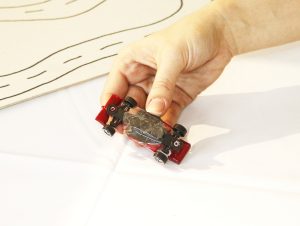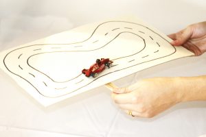 4) Agora é só colocar o carrinho na pista e dar a largada na brincadeira. Mova os palitos embaixo do papel para movimentá-lo.