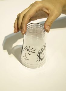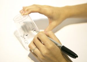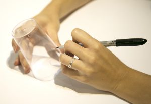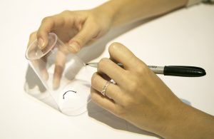Você só vai precisar de três copinhos descartáveis transparentes (é melhor os mais durinhos e sem listras, para ficar mais fácil de desenhar) e uma caneta retroprojetor (se tiver várias cores, melhor ainda!).