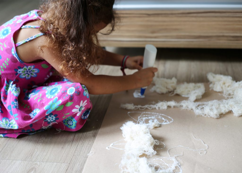 A estopa é um material bem interessante, que desperta a curiosidade das crianças. Pra quem não conhece, ela é uma massa de fios não aproveitados na tecelagem, que se usa para a limpeza de carros, por exemplo. Você encontra pra comprar em lojas de produtos de limpeza, supermercados grandes ou lojas de artigos para carro. O preço é bem em conta. E acredite: este material pode render uma boa brincadeira artística.