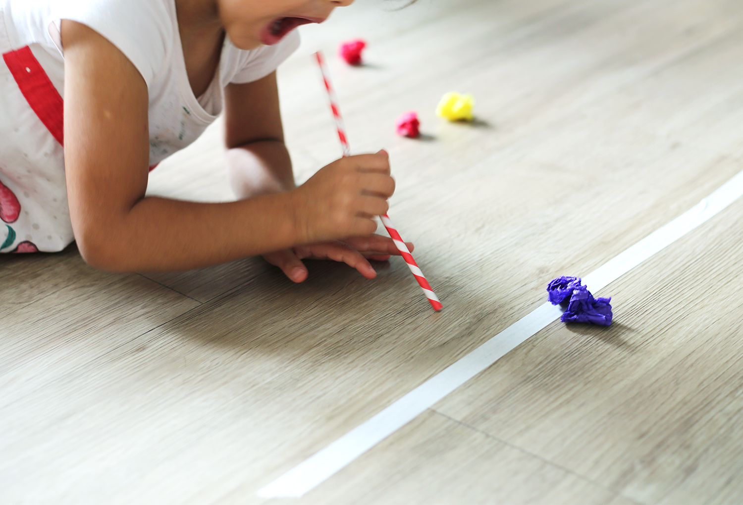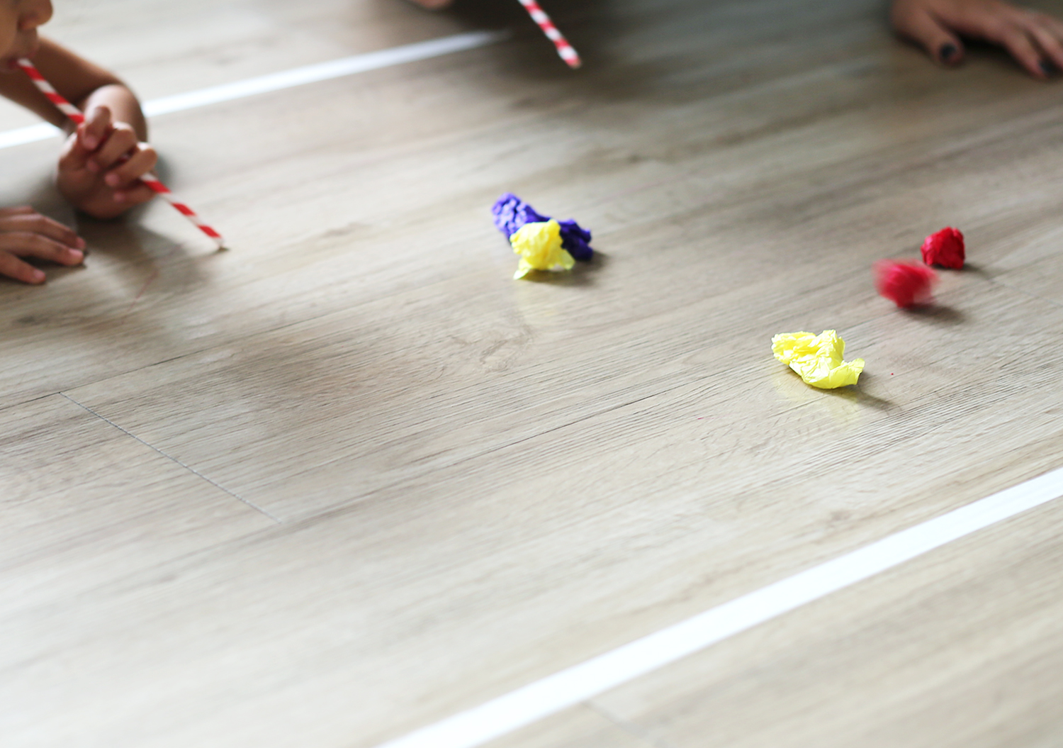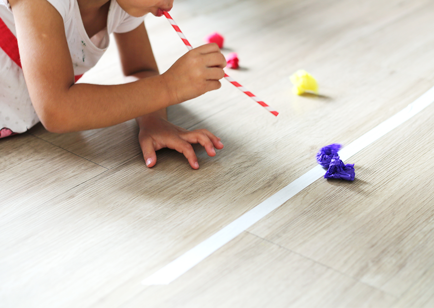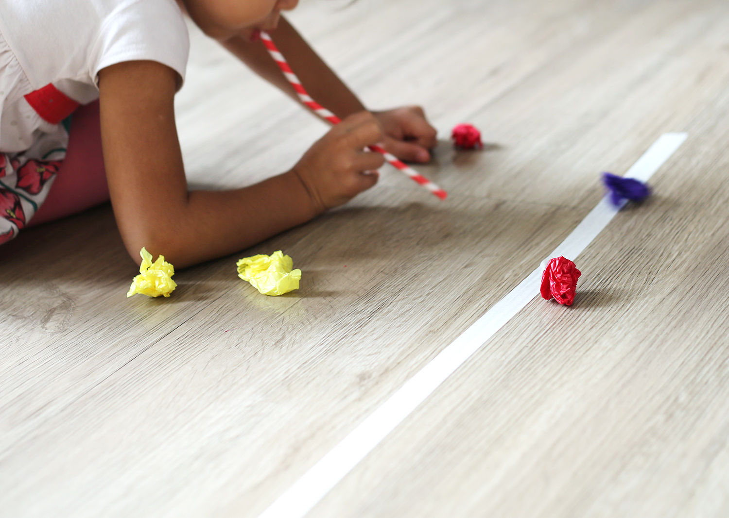 Colamos duas tiras de fita crepe paralelas no chão, a uma curta distância entre elas, e pedimos a ajuda da Luiza para amassar algumas bolinhas de papel colorido. Então, entregamos um canudo a ela e explicamos o desafio: levar as bolinhas de uma linha à outra apenas assoprando-as com o canudinho.