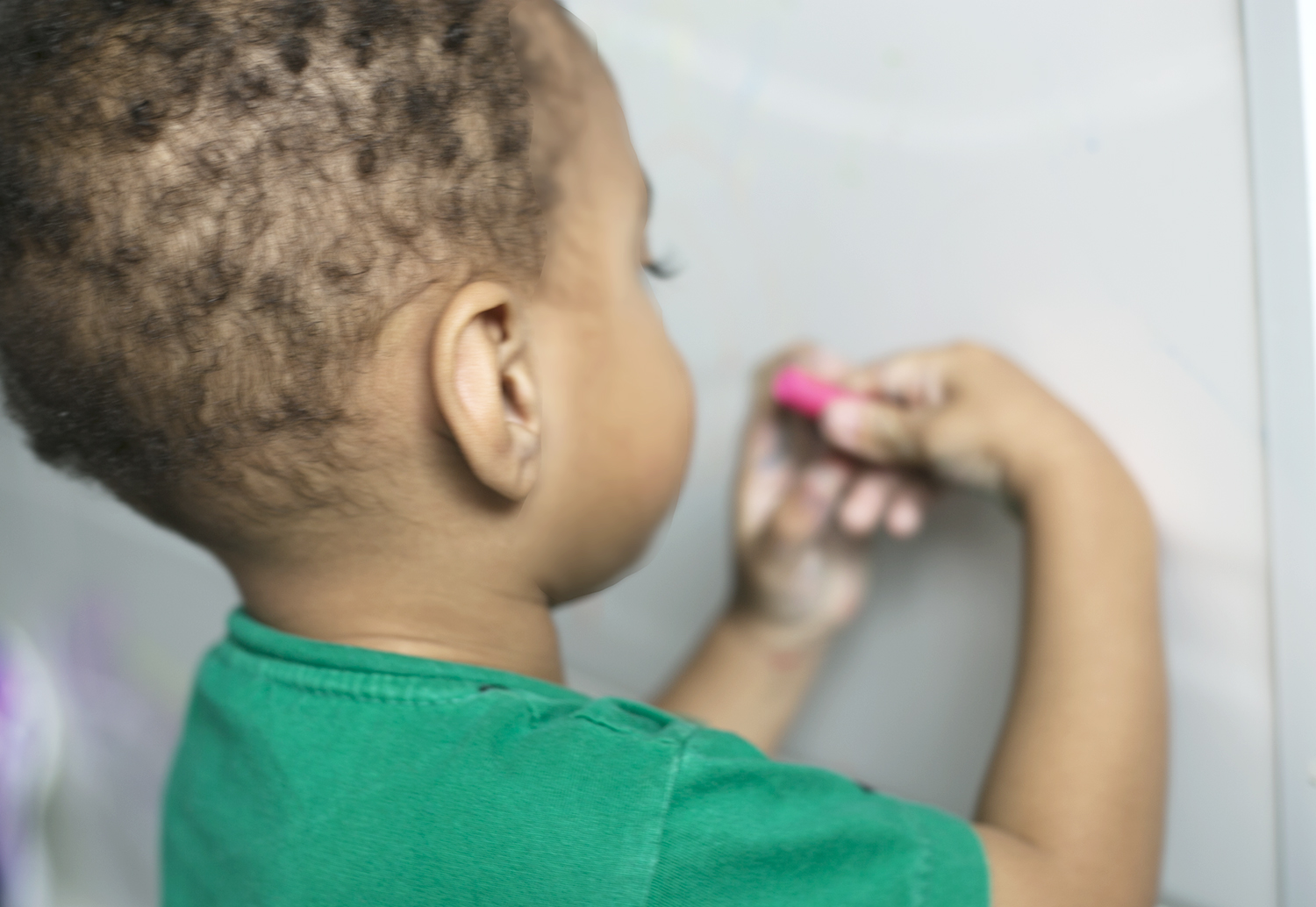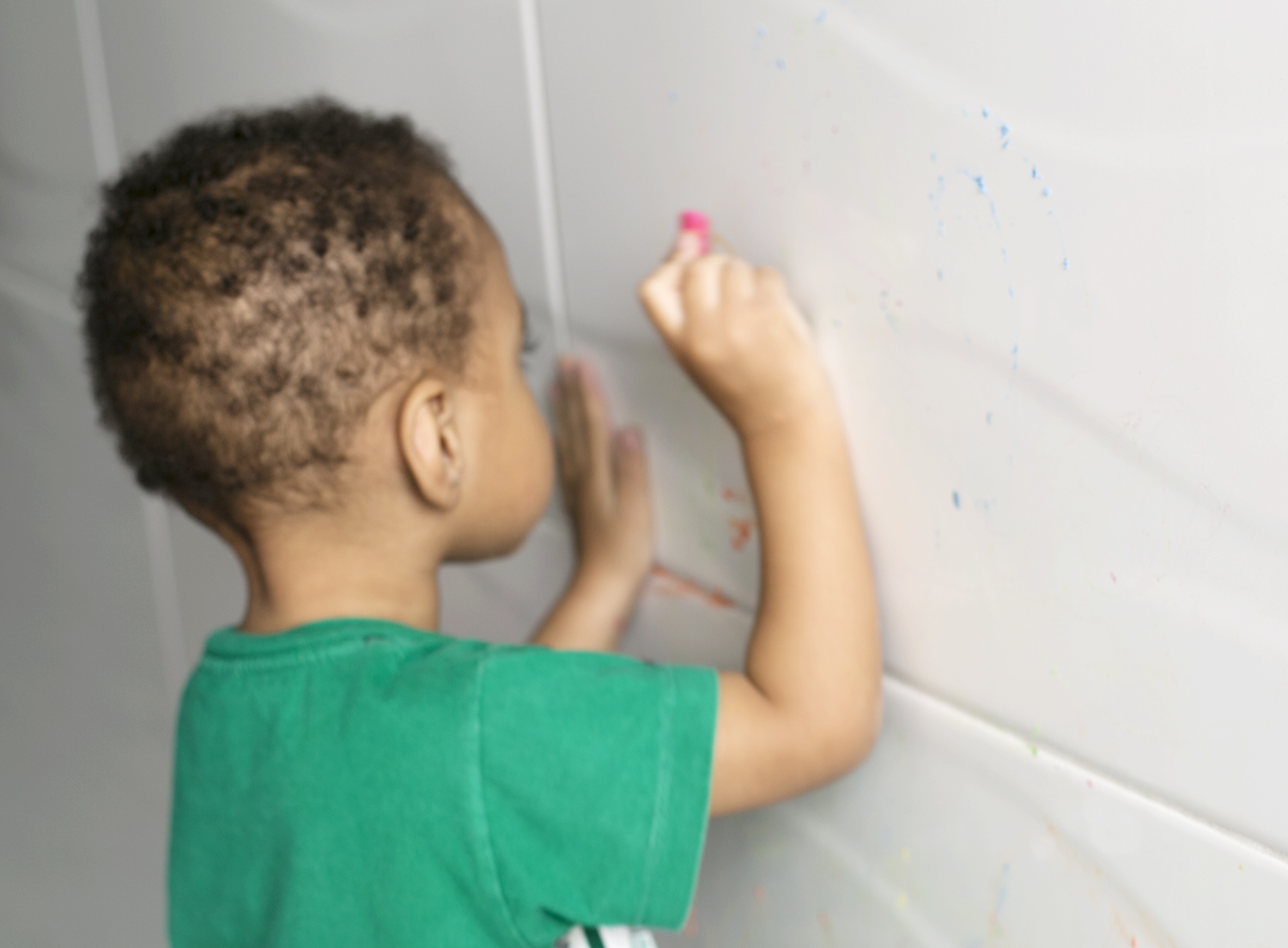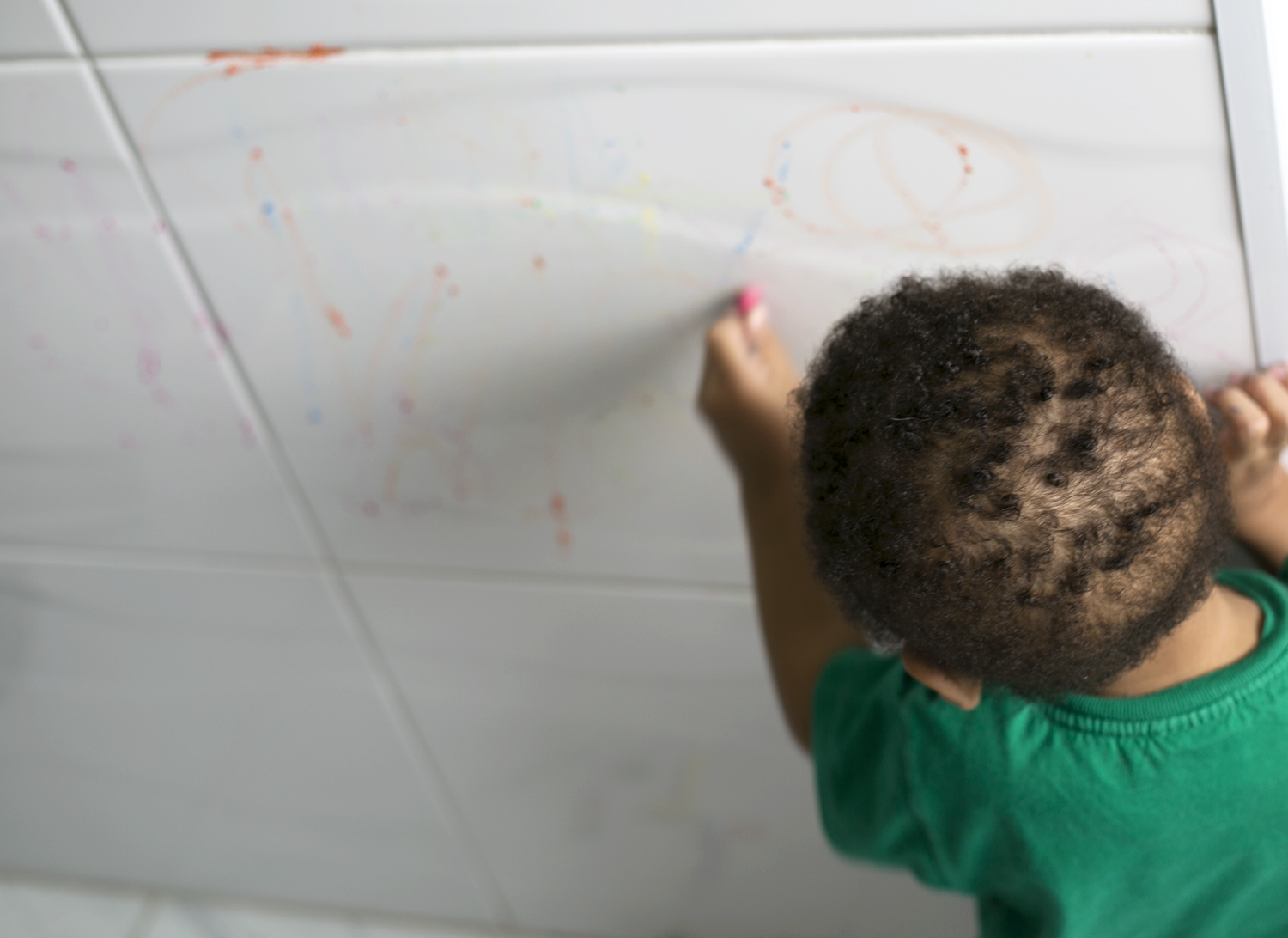 Se mamães e papais costumam ficar de cabelo em pé quando as crianças desenham na parede, saibam que é justamente essa a proposta desta brincadeira. Mas não estamos falando de qualquer parede: estamos falando de algum cantinho coberto de azulejo. Pode ser na cozinha, na área de serviço ou no banheiro, tanto faz. E também não é qualquer material de desenho: nós usamos giz de lousa molhado, para o traço ficar mais forte. E o melhor: depois é só passar um paninho molhado que sai tudo fácil, fácil.