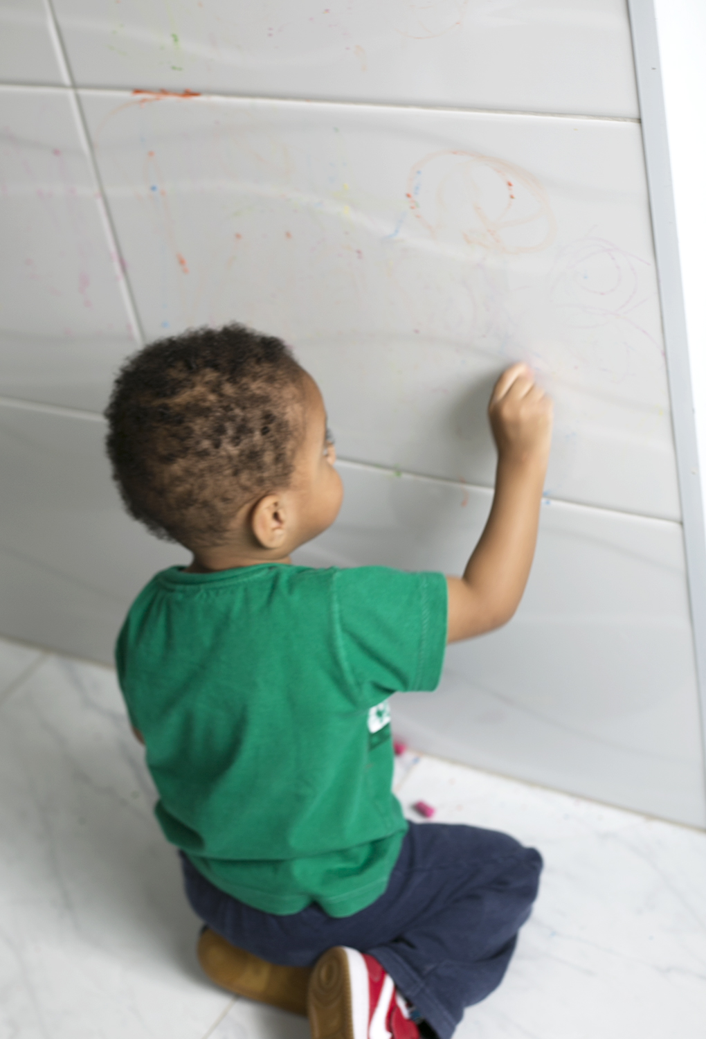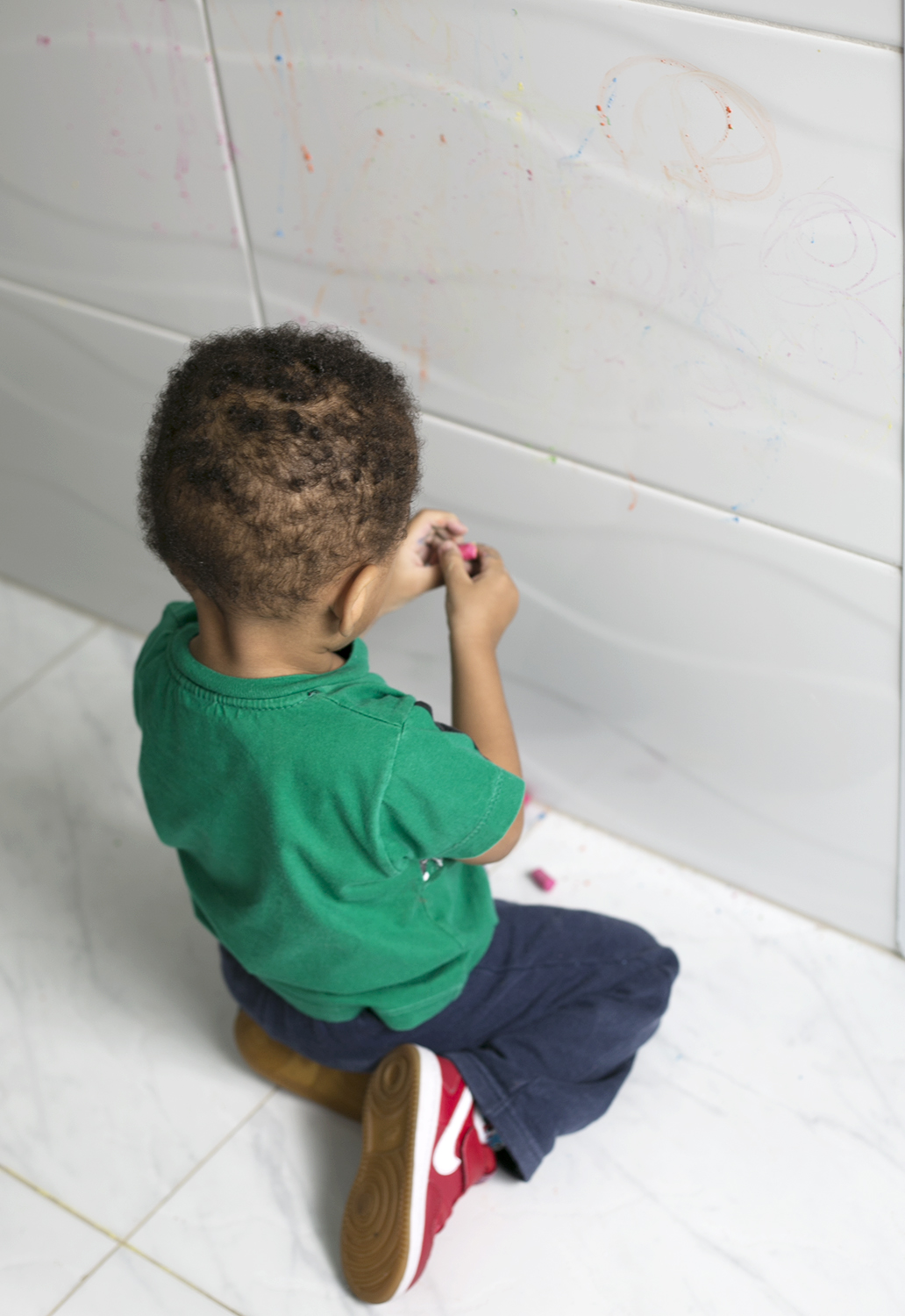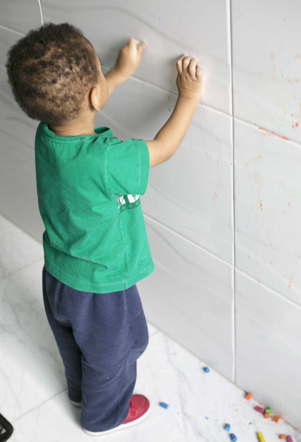 Quando ele se cansou, só tivemos o trabalho de guardar os gizes e passar um paninho na parede e no chão. Até do rejunte foi fácil de tirar os rabiscos.