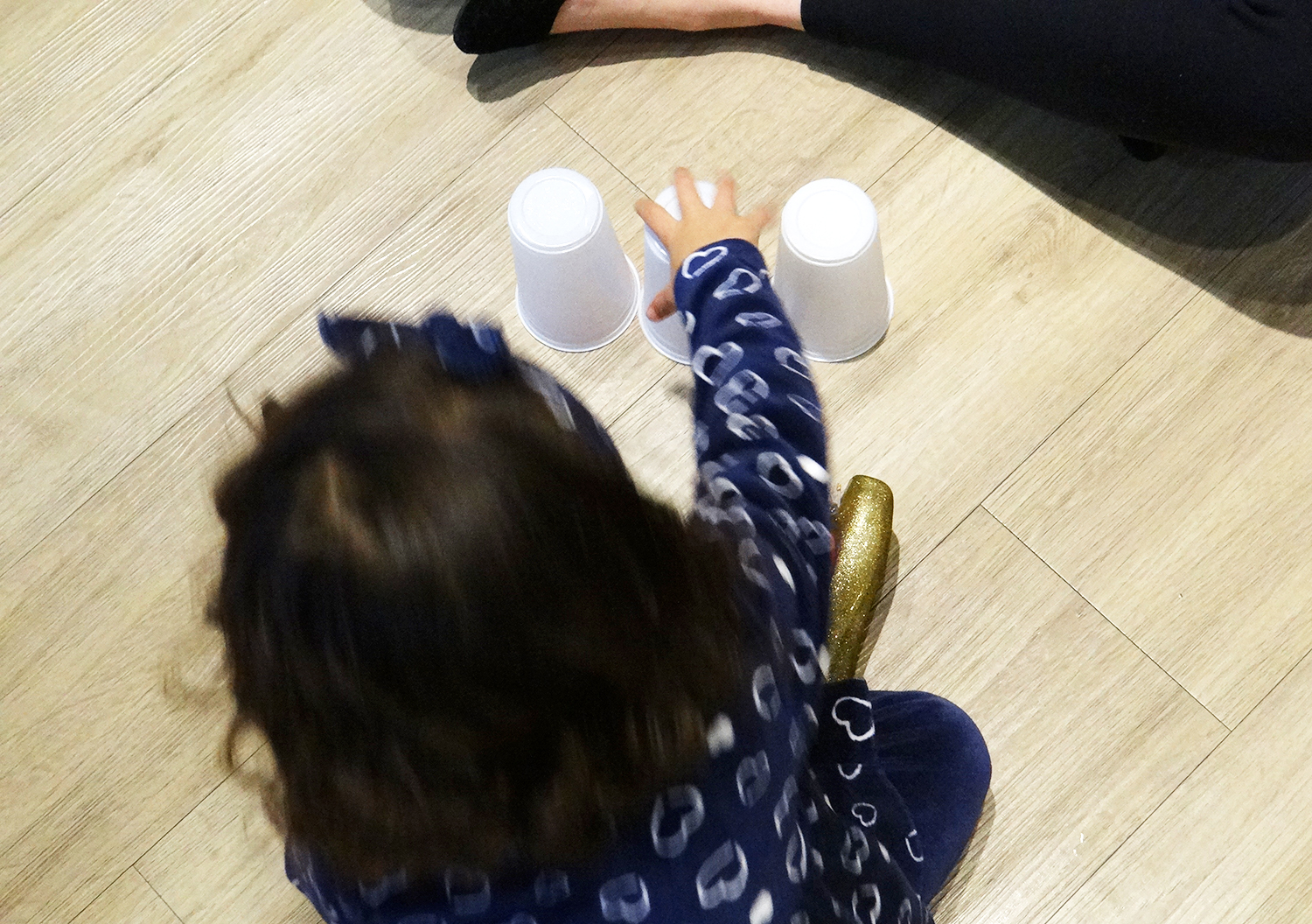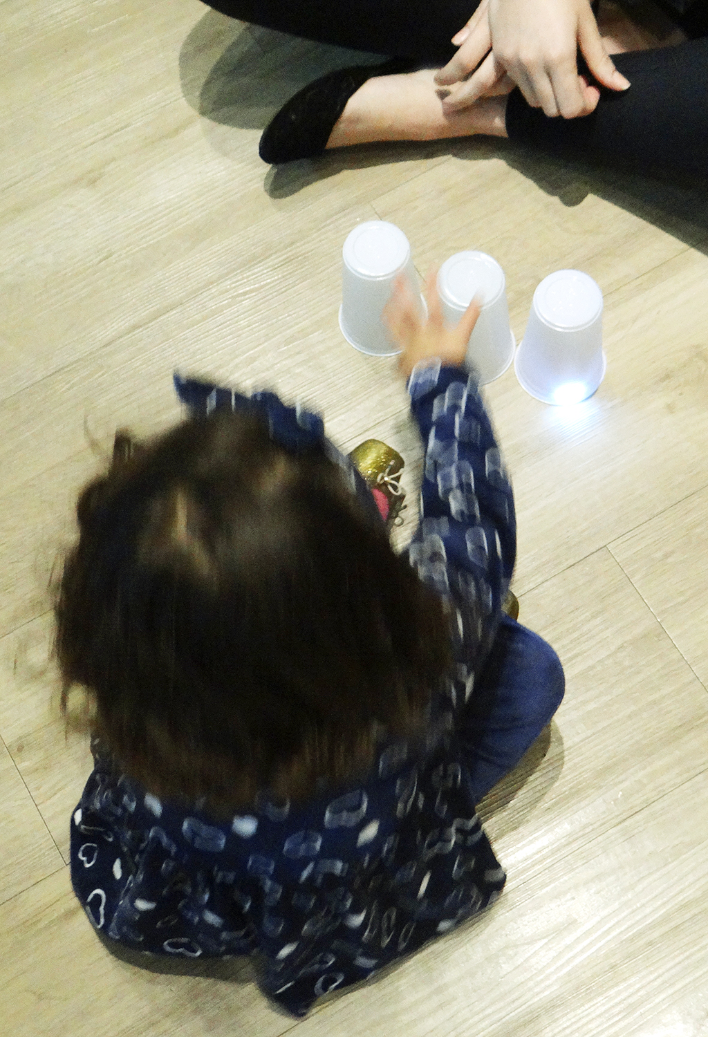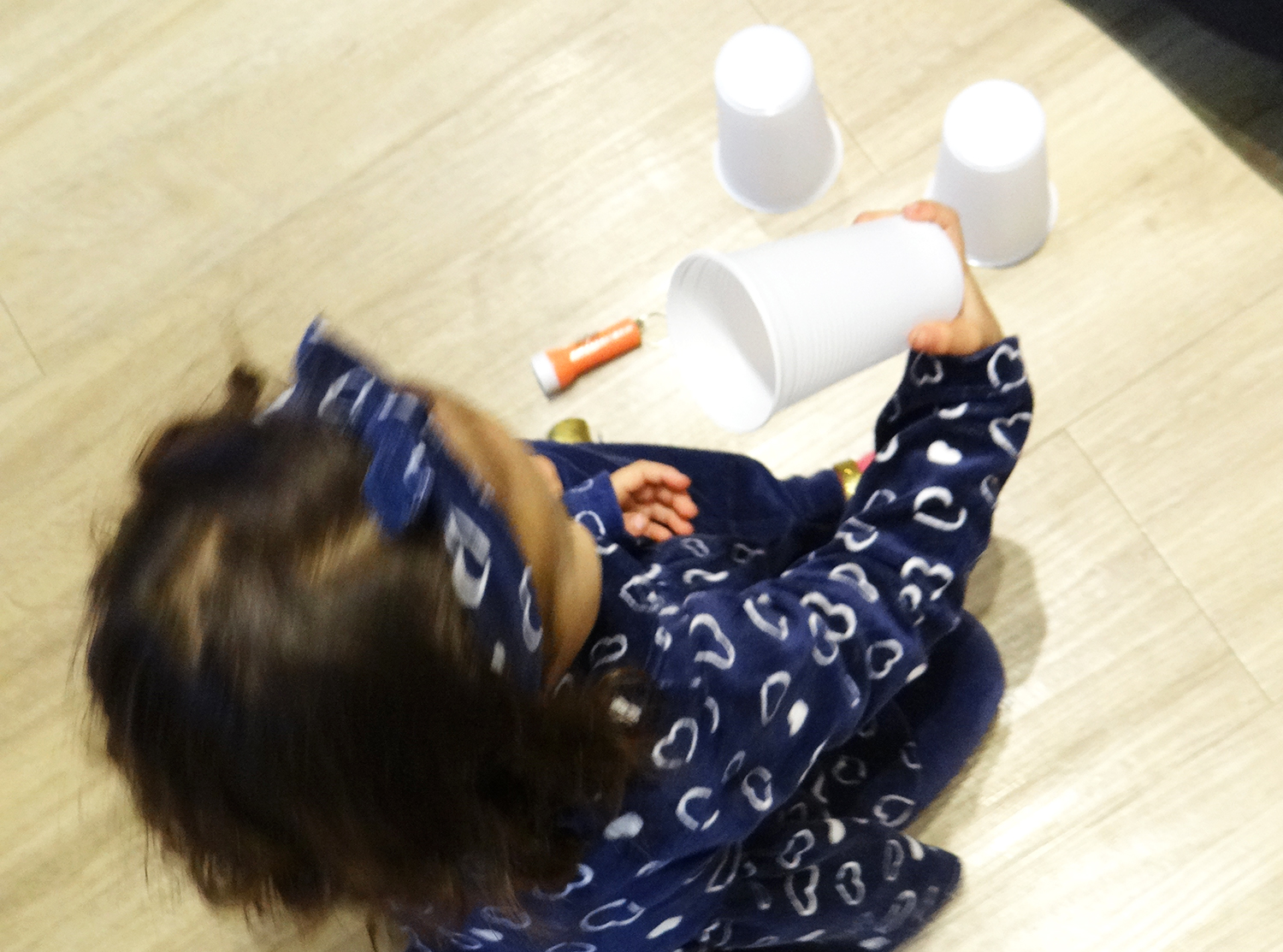 A gente usou três copinhos descartáveis de plástico, mas você pode utilizar qualquer um que tenha em casa (desde que não seja transparente). E o objeto que escolhemos para esconder foi um pequeno chaveiro de lanterna, que a Luiza adora. Colocamos a lanterna sob um dos copos e sugerimos à Lulu que tentasse encontrá-la. E lá foi ela.