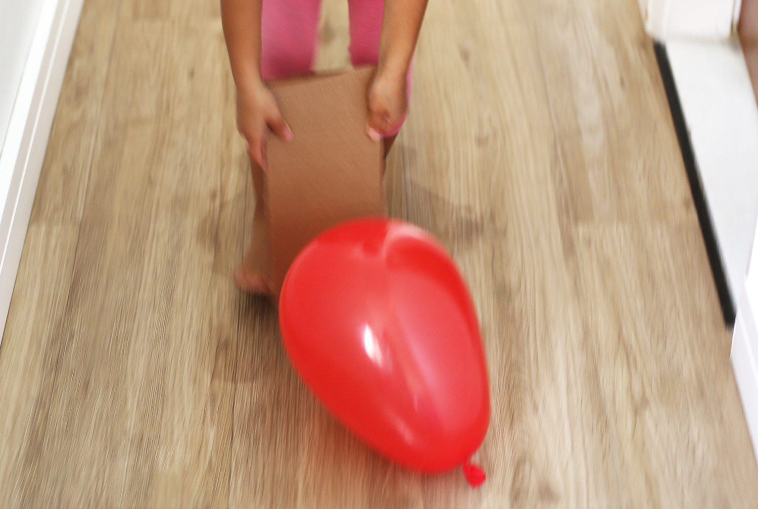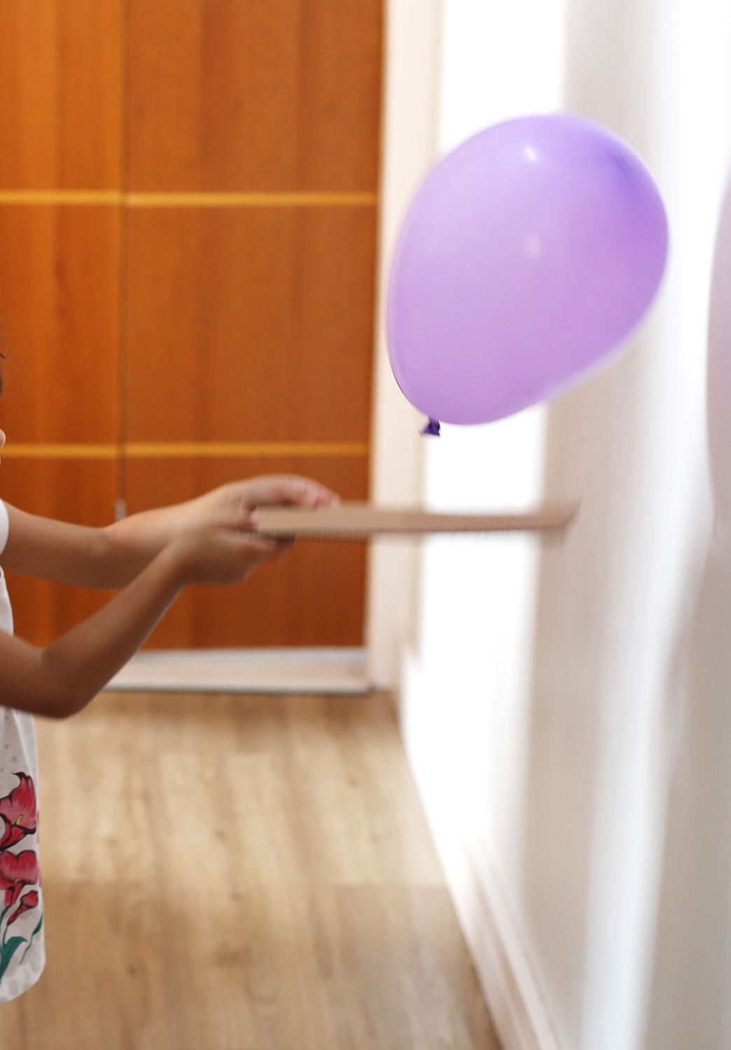Enchemos algumas bexigas, cortamos a aba de uma caixa de papelão e pronto. A ideia é que a criança desloque as bexigas de um ponto a outro apenas abanando o papelão, fazendo um vendaval.