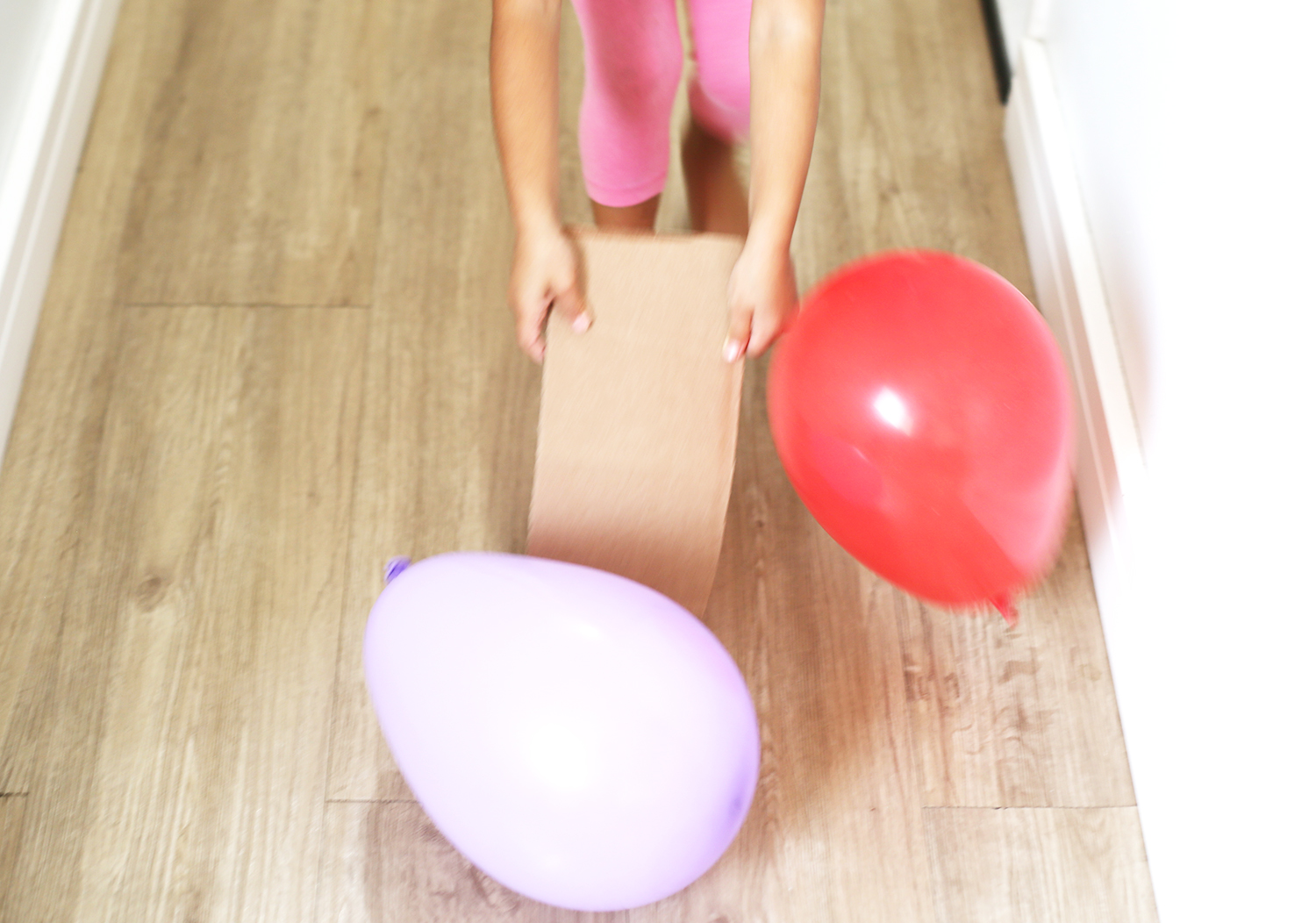 Mas não demorou muito e ela logo inventou uma nova brincadeira. Ao invés de fazer um ventão nas bexigas, ela começou a empurrá-las com o papelão, batendo com ele nelas.