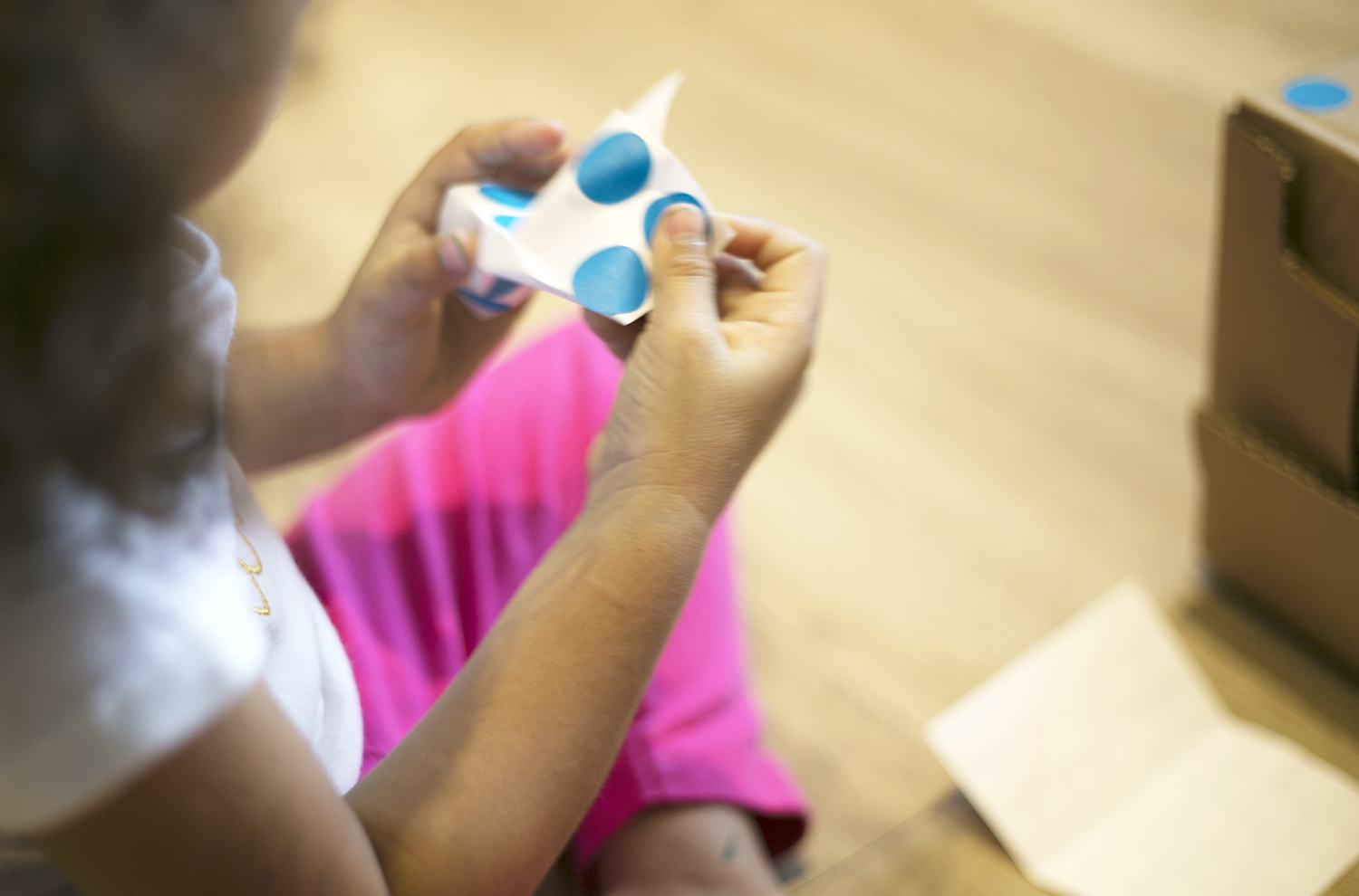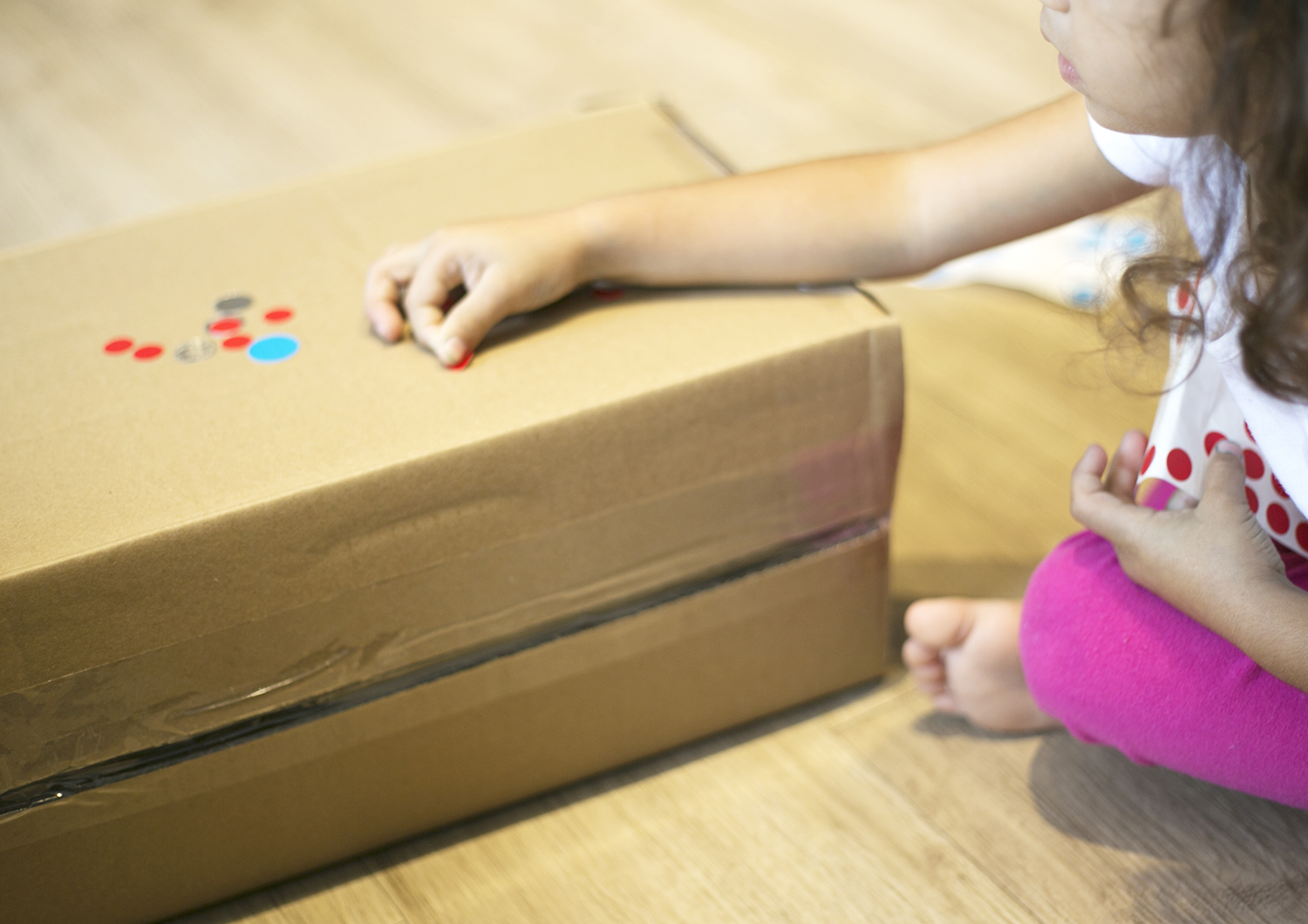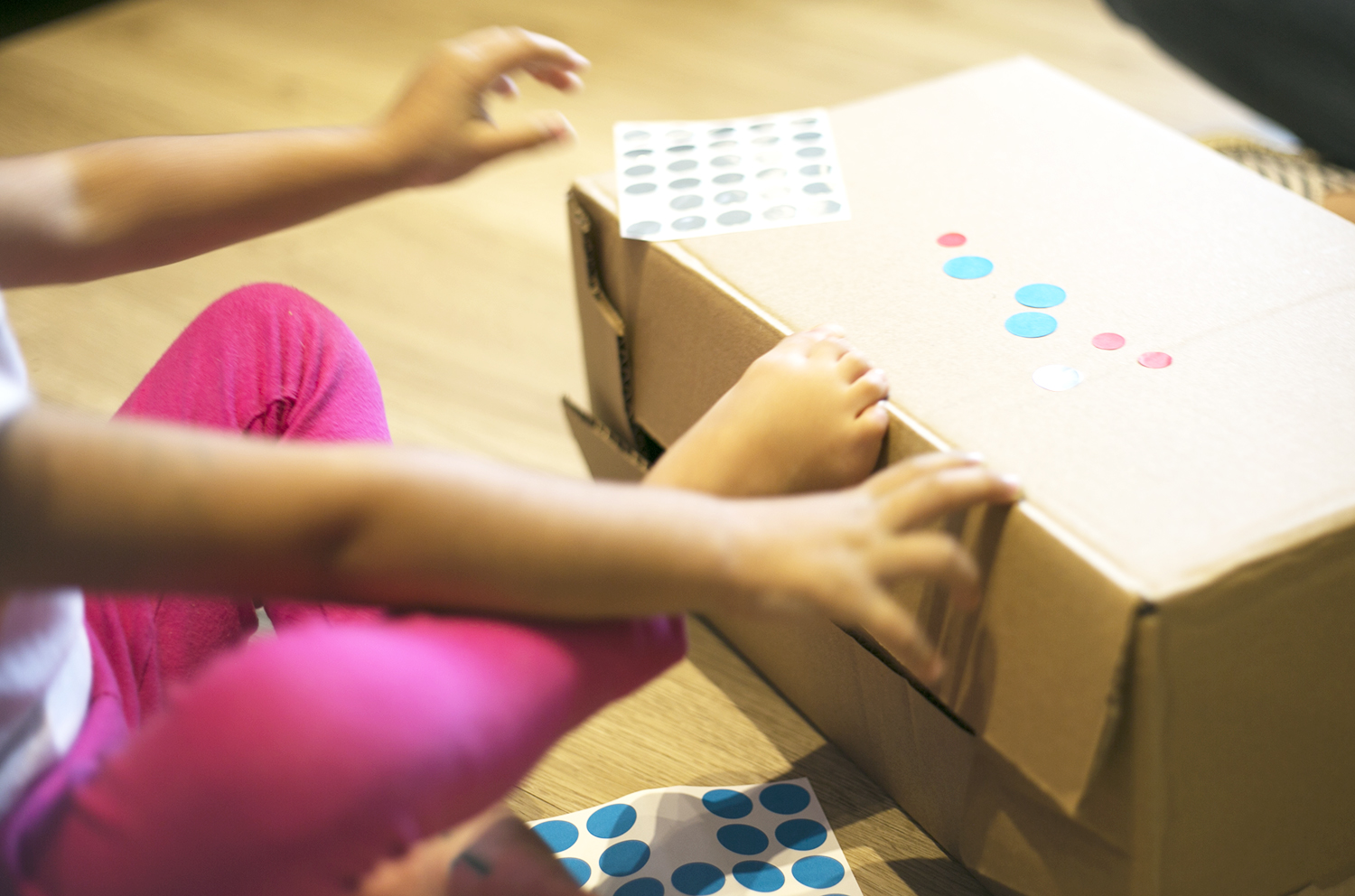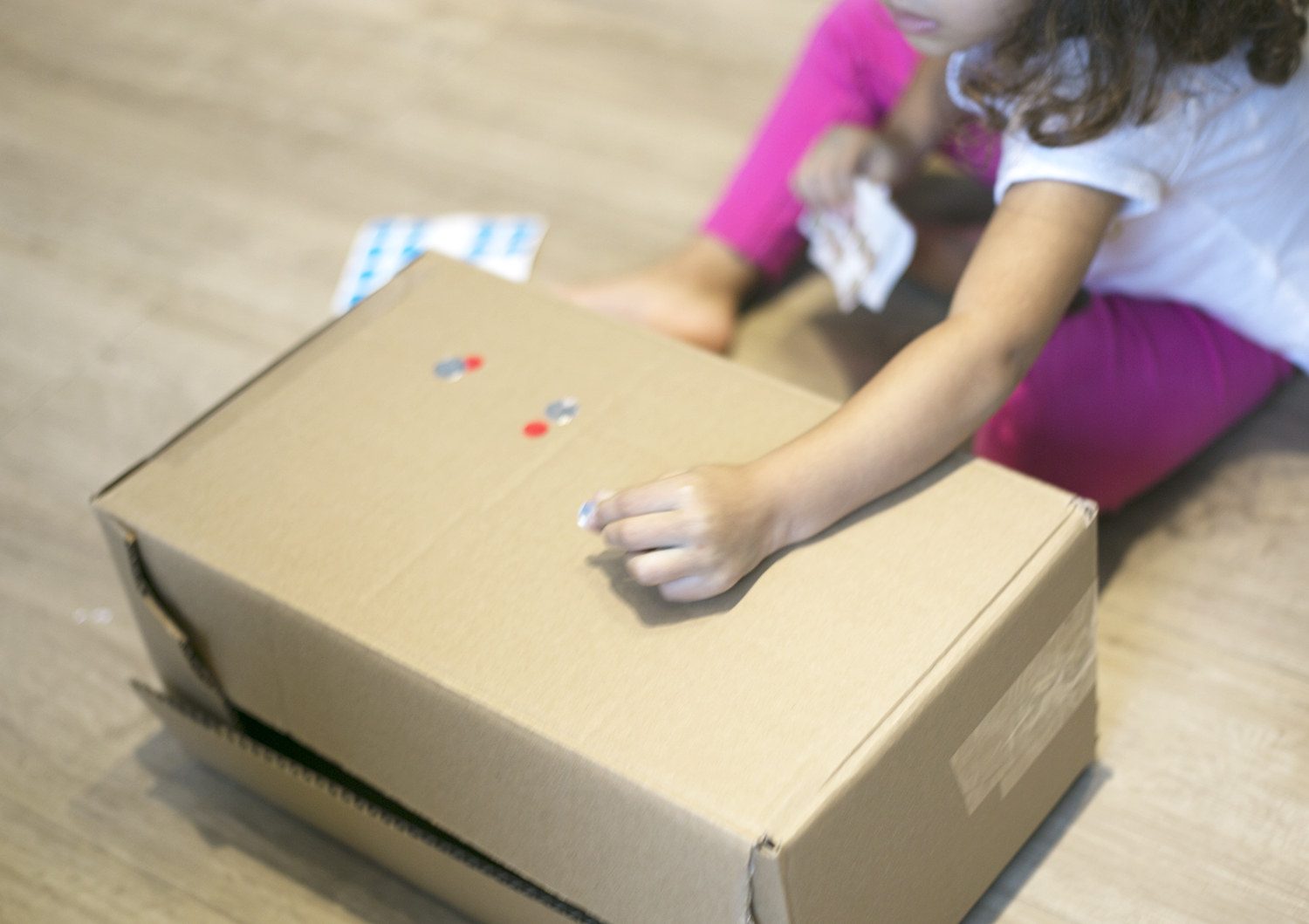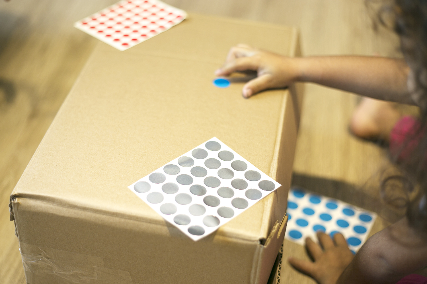 Nós oferecemos à Luiza algumas cartelas daquelas etiquetas adesivas redondinhas, de diferentes cores e tamanhos. E, junto com elas, uma caixa de papelão. Nem precisou muita explicação para que a Luiza começasse a destacar as bolinhas e a colá-las na caixa.