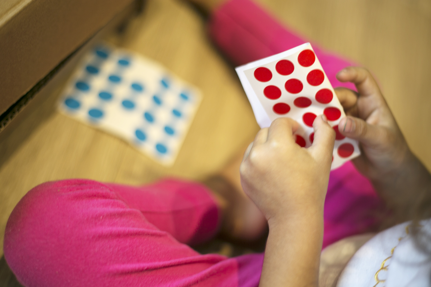 A hora de descolar a bolinha na cartela exigiu dela bastante concentração. Algo que nos parece tão banal e que é um baita desafio para as crianças, não é mesmo? Nós não interferimos, e deixamos que ela realizasse cada etapa. Aos poucos, ela foi aperfeiçoando a técnica e percebeu que, se amassasse um pouquinho a cartela, conseguia pegar a bolinha com mais facilidade.