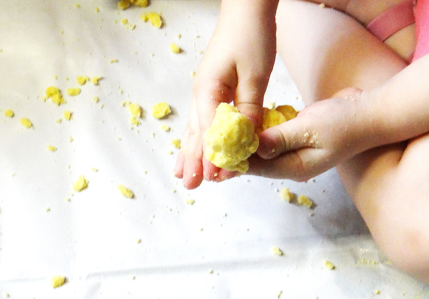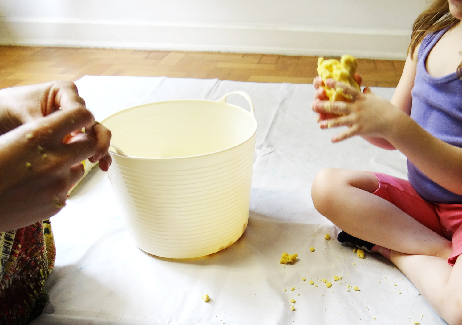 A Sofie participou de todo o processo de confecção da meleca que, na verdade, é bem simples. Basta misturar farinha de milho com água. Não há uma quantidade exata, é tudo no olhômetro mesmo.