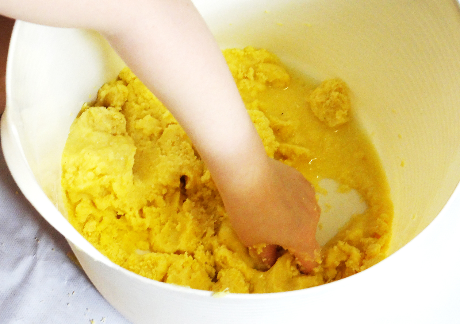 Despejamos a farinha de milho em um balde e acrescentamos um pouco de água. A Sofie foi ajudando, misturando tudo com as mãos. Atingimos uma consistência parecida com a de uma massinha e brincamos de modelar vários bichos.