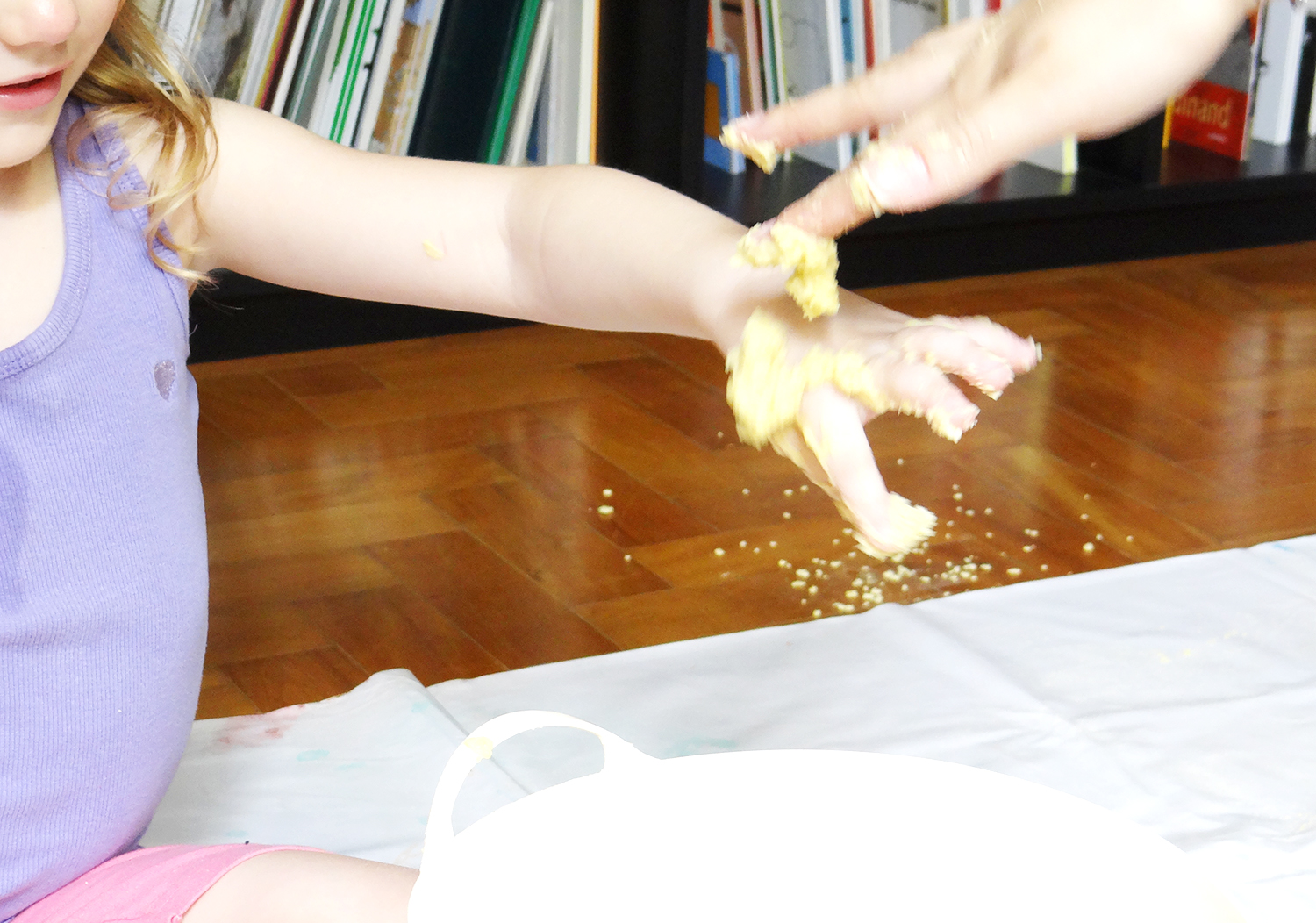 Aí a brincadeira virou passar a meleca nas mãos, deixando-a pingar de uma para a outra.