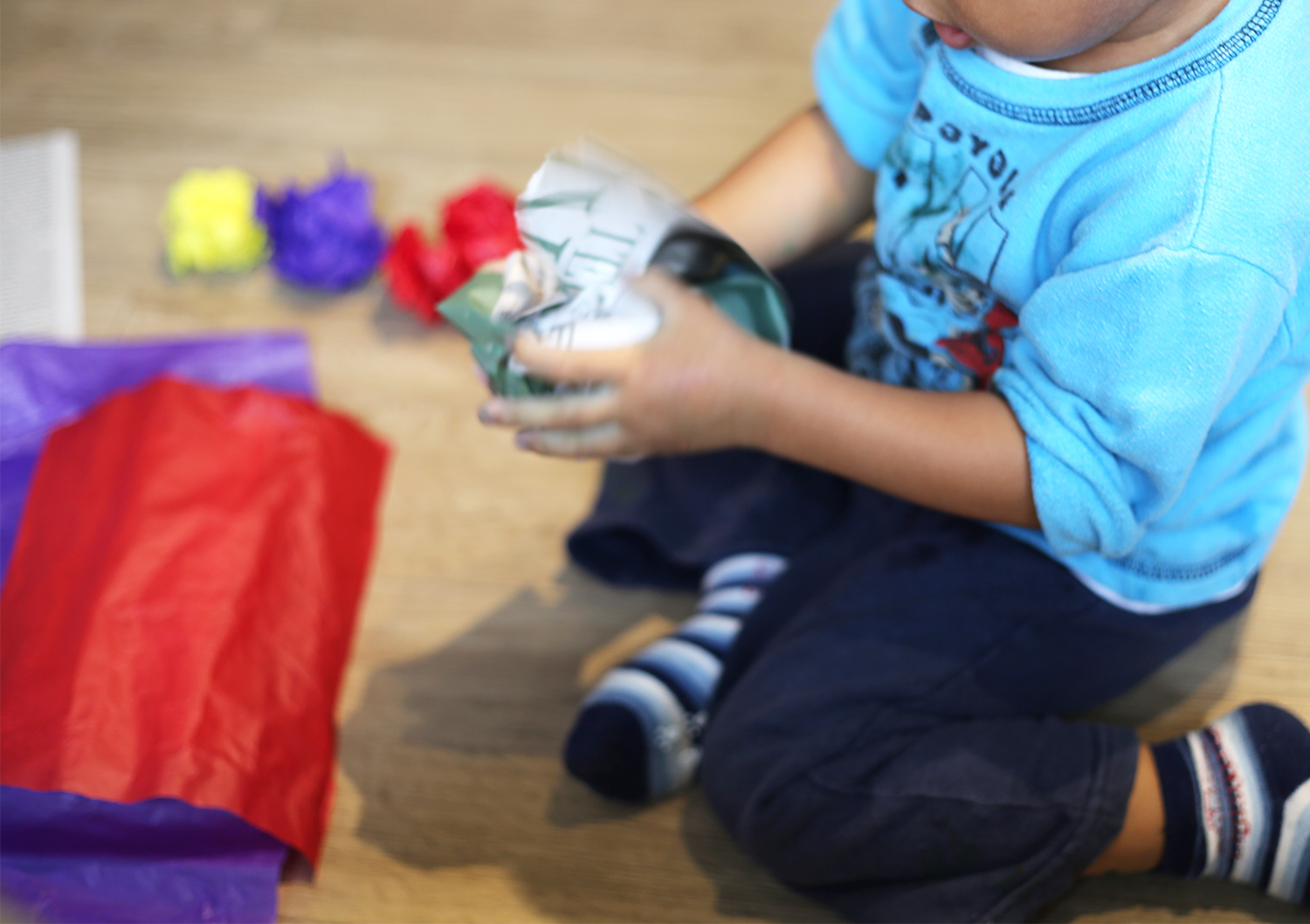 Entregamos papéis de diferentes tipos e cores ao Rafa e pedimos para que ele os amassasse, formando bolinhas. Quer coisa mais legal do que isso para uma criança? Ele logo se pôs a amassar. E só esta etapa já teria rendido uma boa brincadeira. Mas a gente queria mais.
