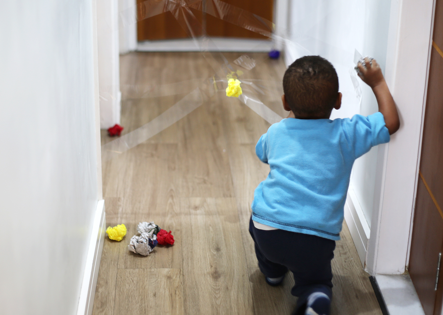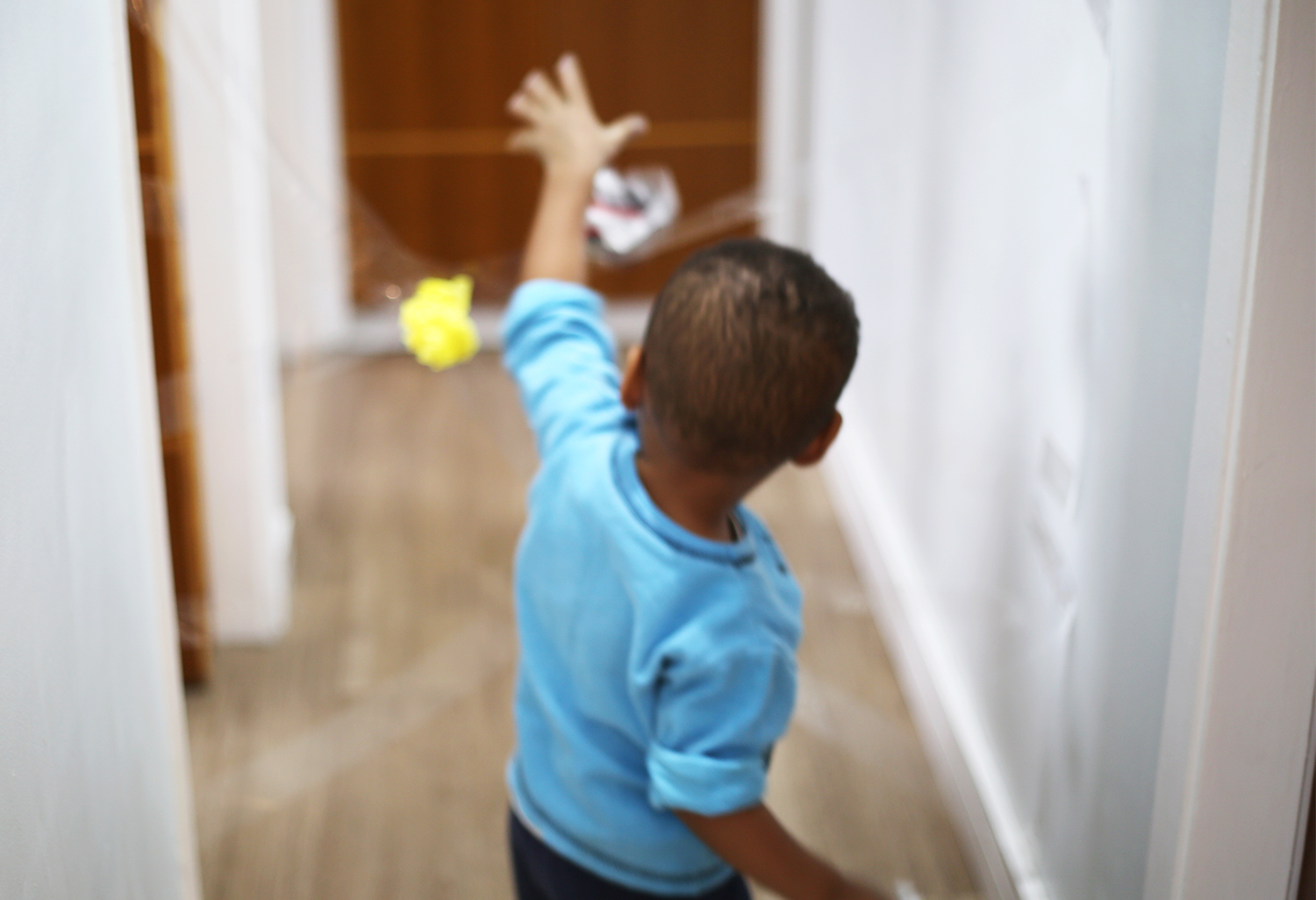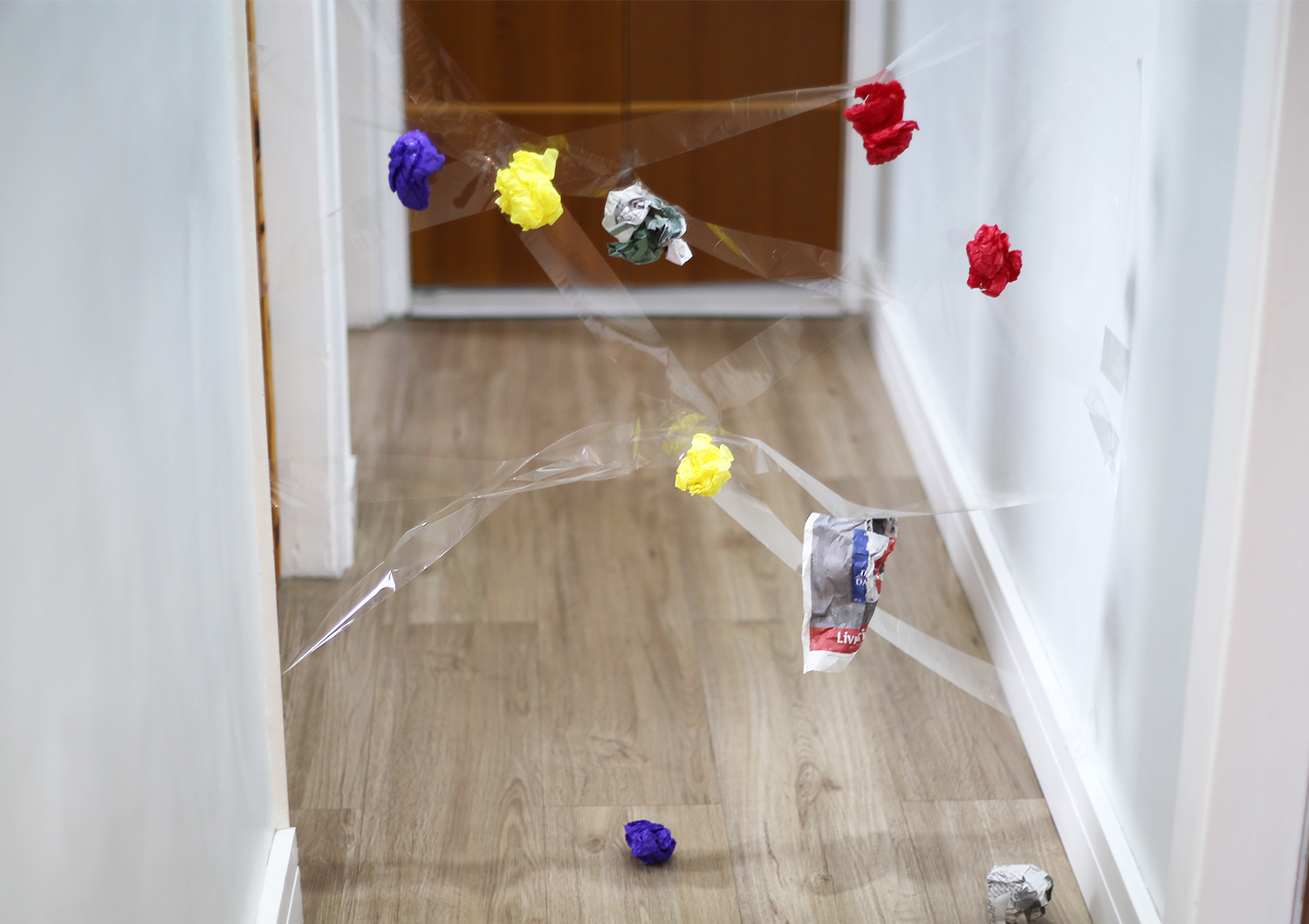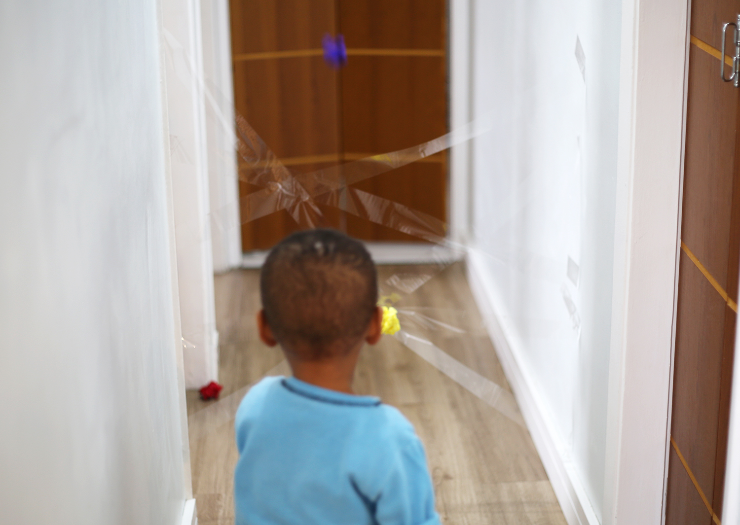 Usamos as duas paredes paralelas do corredor para fazer uma espécie de teia (ou cama de gato) com fita adesiva. E a proposta era arremessar as bolinhas na fita, para que elas ficassem coladas.