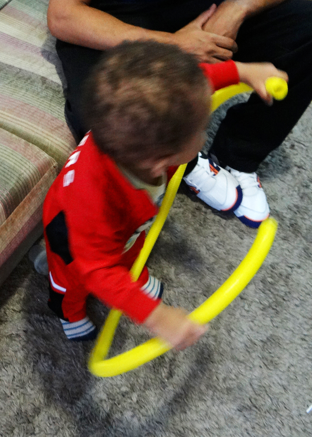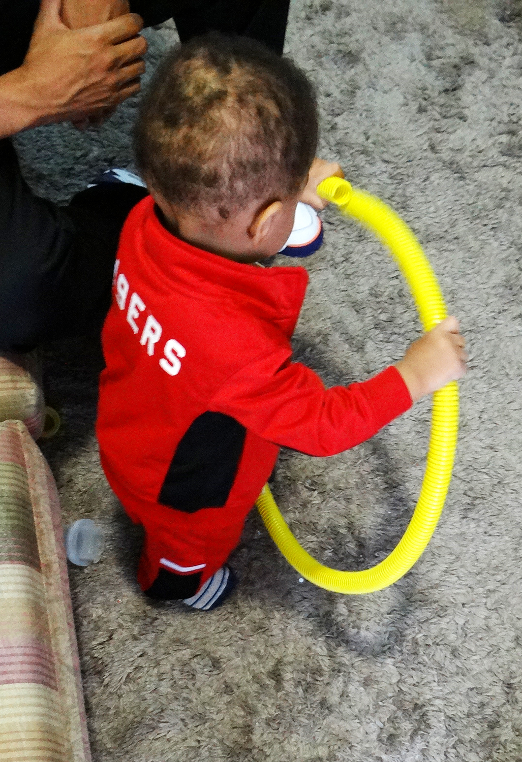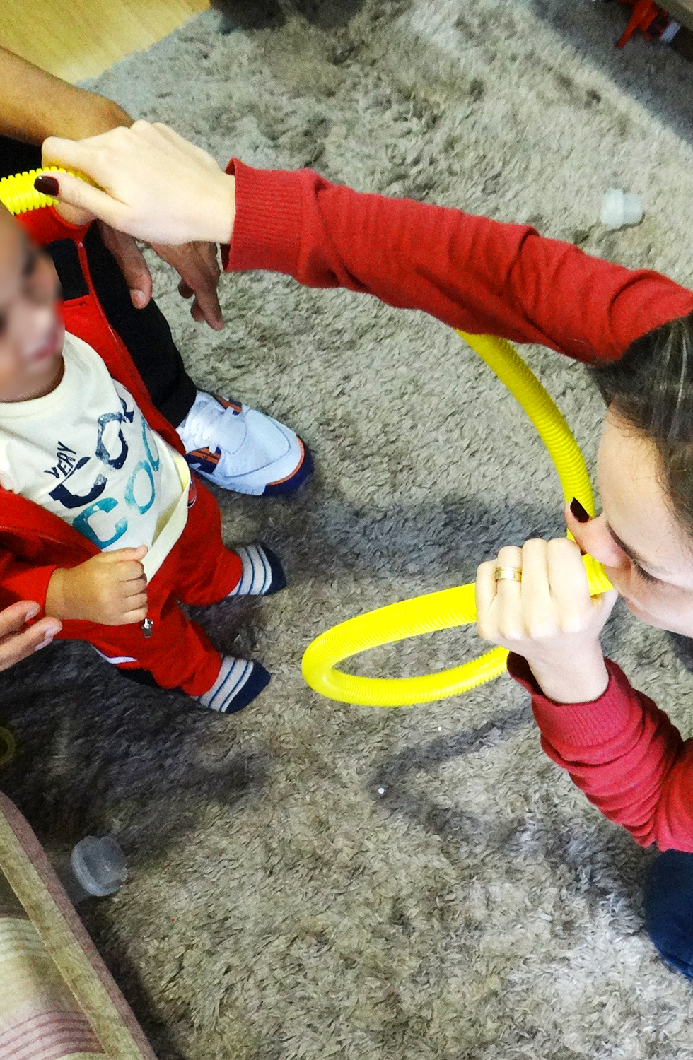 Depois, ele quis manusear o objeto sozinho, com as próprias mãos. Sentiu as várias ondinhas, tentou encaixar uma ponta na outra, formando um círculo, colocou na boca…