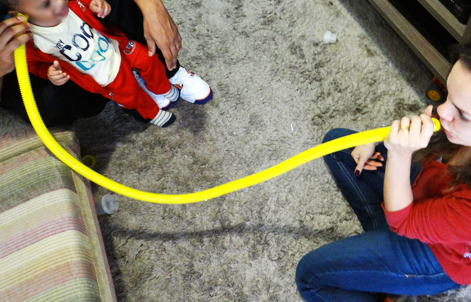 Foi assim que exploramos o objeto com o Rafa. Como ele ainda é pequenininho, ainda não tem muita noção de que precisa colocá-lo na boca para falar e no ouvido quando quiser escutar. Então, a gente deu uma mãozinha. Colocamos uma extremidade no ouvido do Rafa e falamos com ele pela outra. O sorriso que brotou em seu rosto foi sua expressão de satisfação diante da nova descoberta.