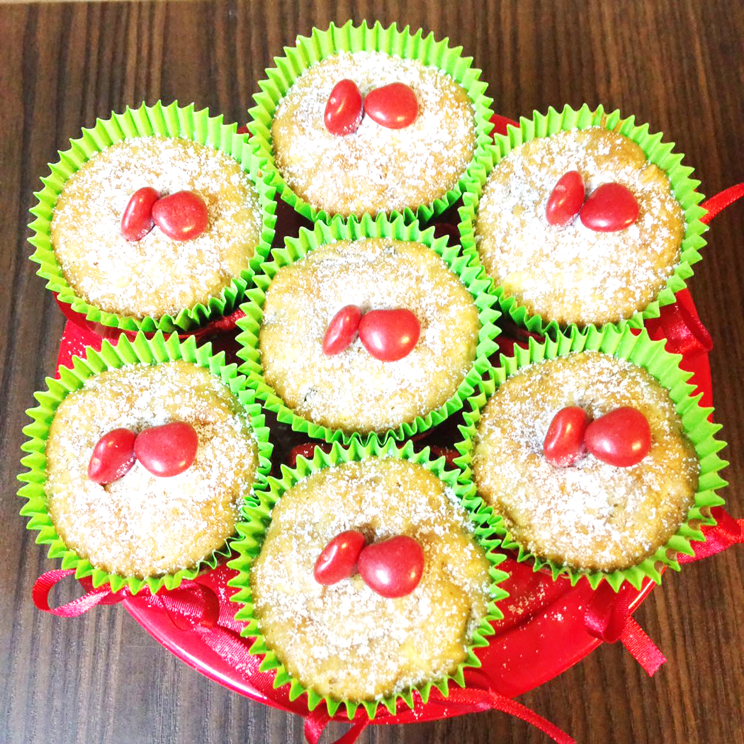 Depois de separar todos os ingredientes, pique as nozes e as maçãs. Em um bool, misture a farinha, a canela, o sal e o fermento e reserve. Na batedeira, bata as gemas, a manteiga e o açúcar. Acrescente o leite e a mistura de farinha, alternando entre o líquido e os secos, e continue batendo. Em seguida, já fora da batedeira, coloque as maçãs, as nozes, as passas e a essência de panetone. Por último, bata as claras em neve e vá acrescentando-a à massa delicadamente, aos pouquinhos. Preencha as forminhas para cupcake até 3/4 da capacidade. Leve para assar em forno pré-aquecido a 180º por aproximadamente 15/20 minutos. Para decorar, basta usar a criatividade. Nós polvilhamos açúcar gelado (mas também pode ser açúcar de confeiteiro) e colocamos confeitos vermelhos em formato de coração.