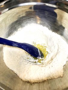 Misture a farinha, o sal e o azeite, acrescentando a água morna aos poucos até atingir uma consistência que desgrude das mãos. Se você perceber que colocou água demais, corrija acrescentando mais farinha.