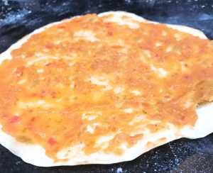 Após dourar, tire do fogo, vire a massa e acrescente o molho e a muçarela. Volte para o fogo e coloque uma tampa sobre a frigideira. Aguarde até ficar dourada do outro lado, com a muçarela derretida.